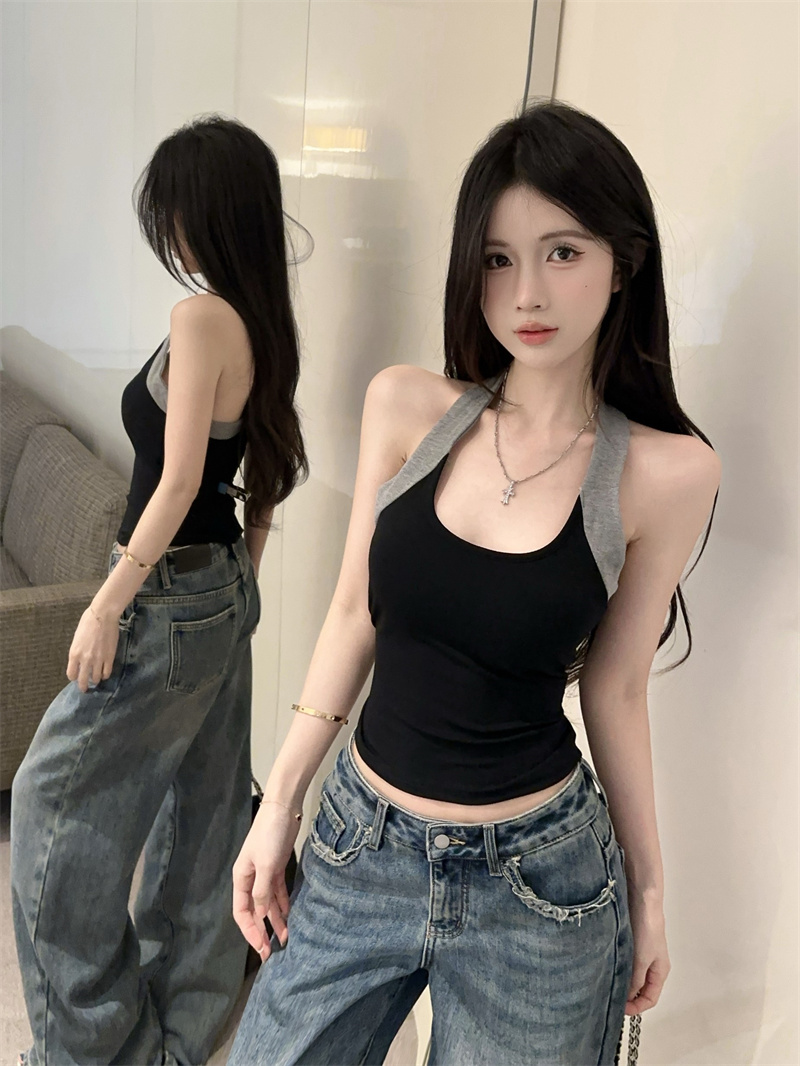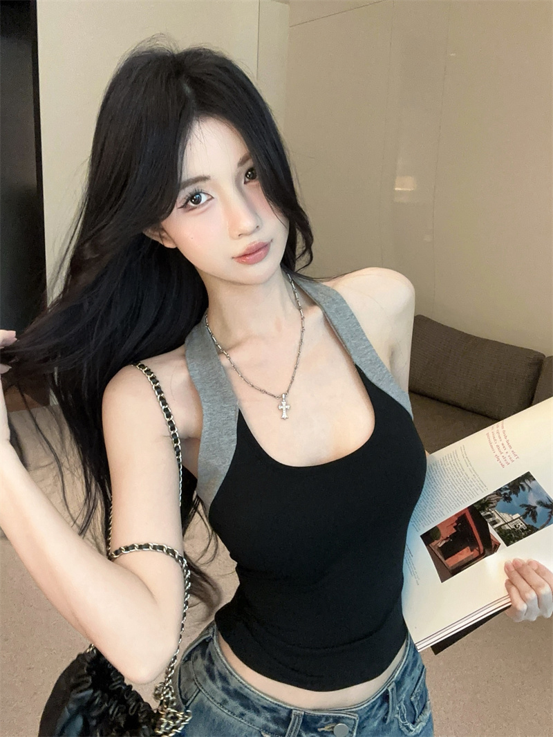 BY13516# 复古辣妹撞色挂脖吊带背心性感露背上衣 服裝批發女裝批發服飾貨源