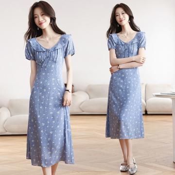 BY13529# 碎花连衣裙夏季新款女装泡泡袖收腰V领仿牛仔日系娃娃裙 服裝批發女裝批發服飾貨源