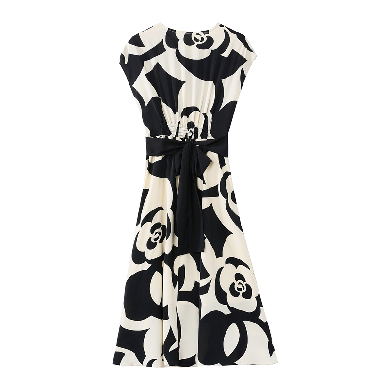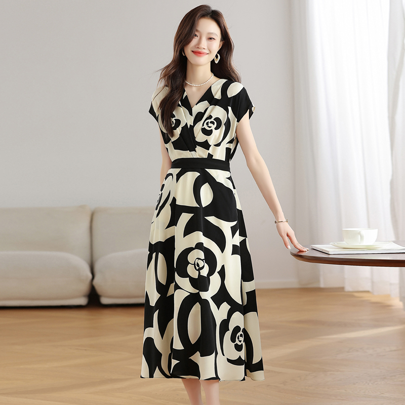 BY13553# 夏季新款女法式v领收腰气质a字裙温柔风印花中长款雪纺连衣裙 服裝批發女裝批發服飾貨源