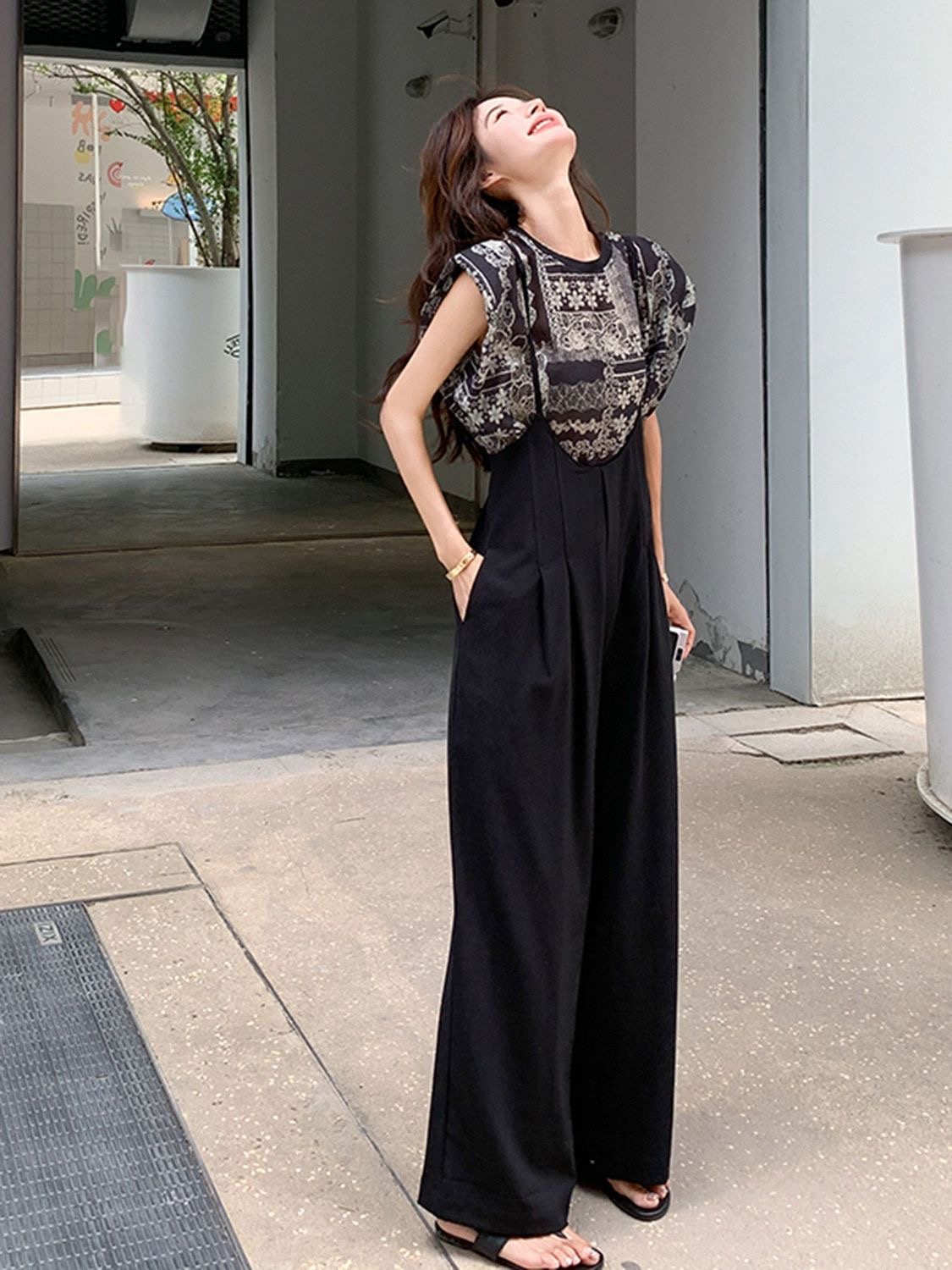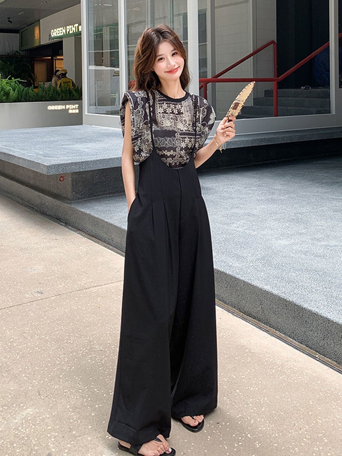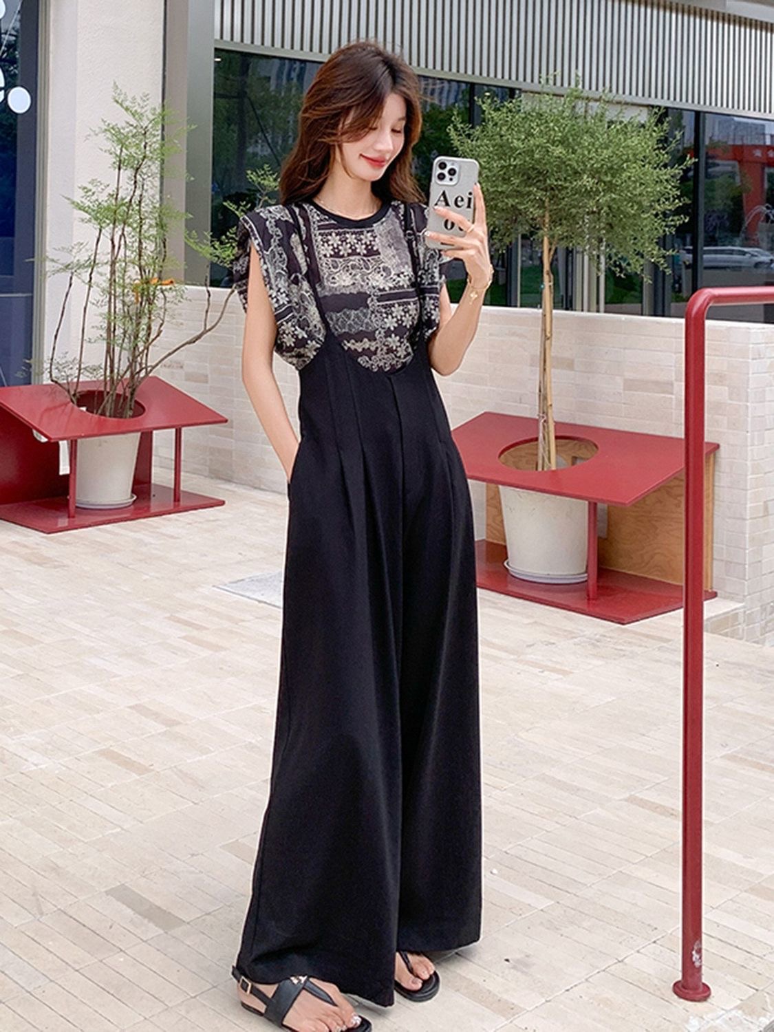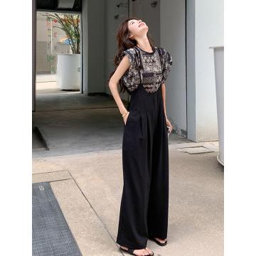 吊带连体裤套装女夏季新款休闲印花T恤垂感背带阔腿裤两件套 服裝批發女裝批發服飾貨源