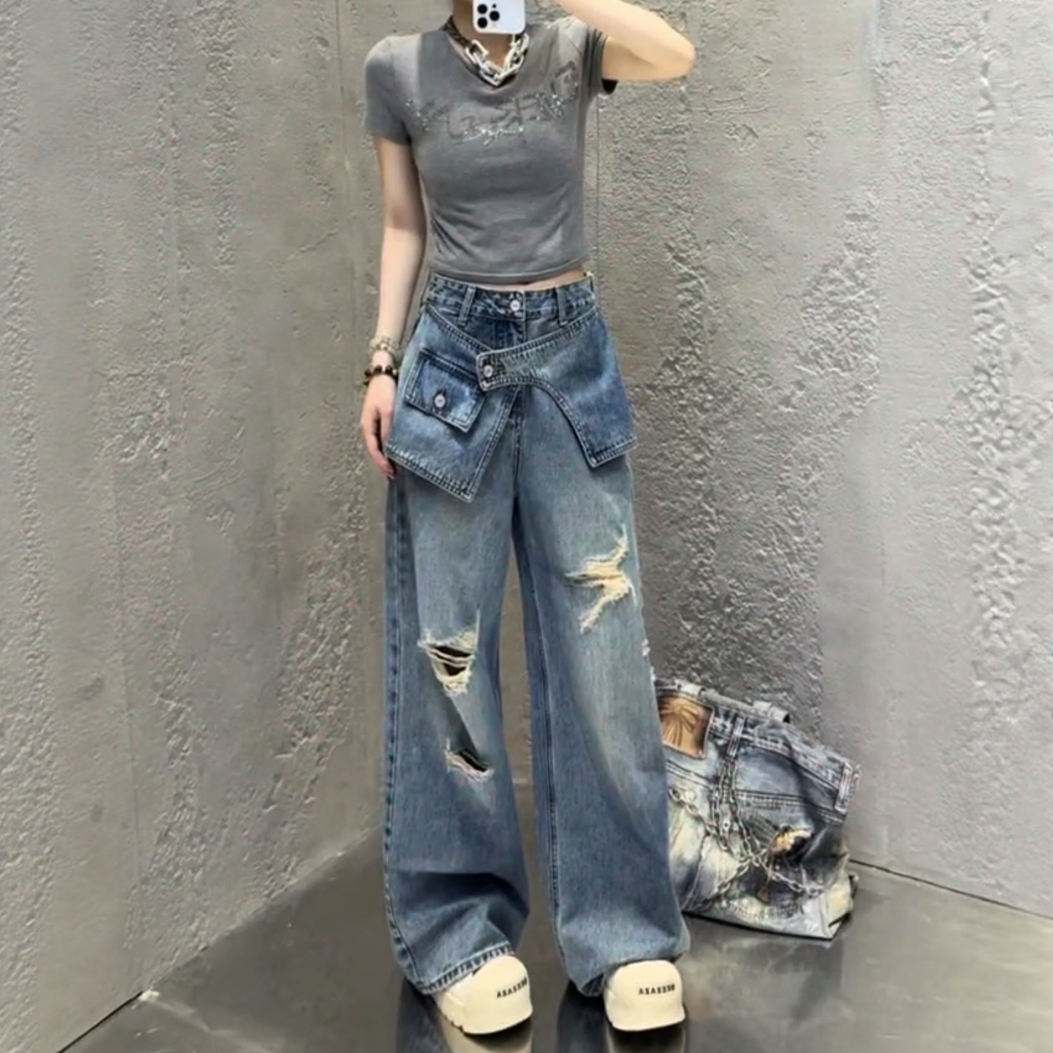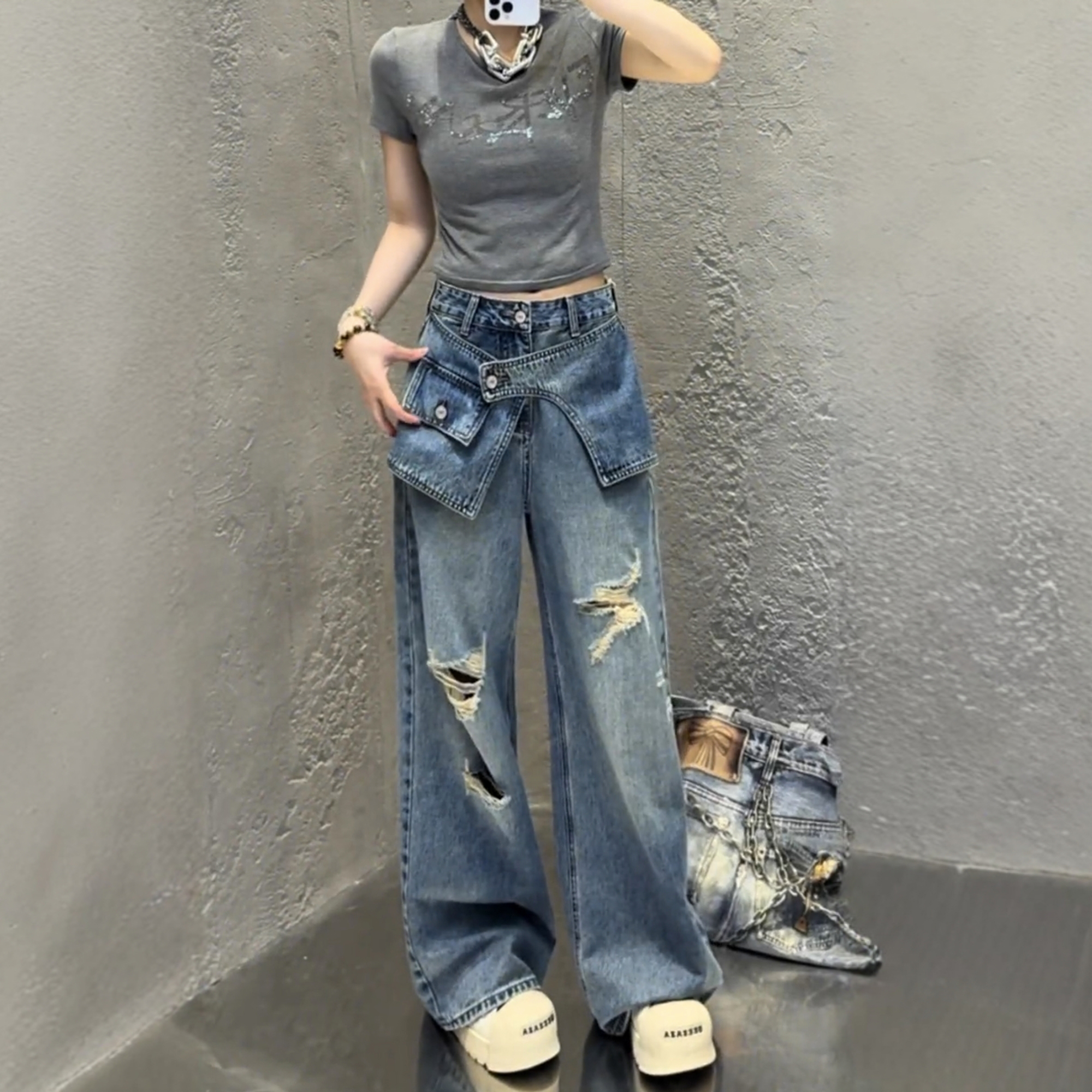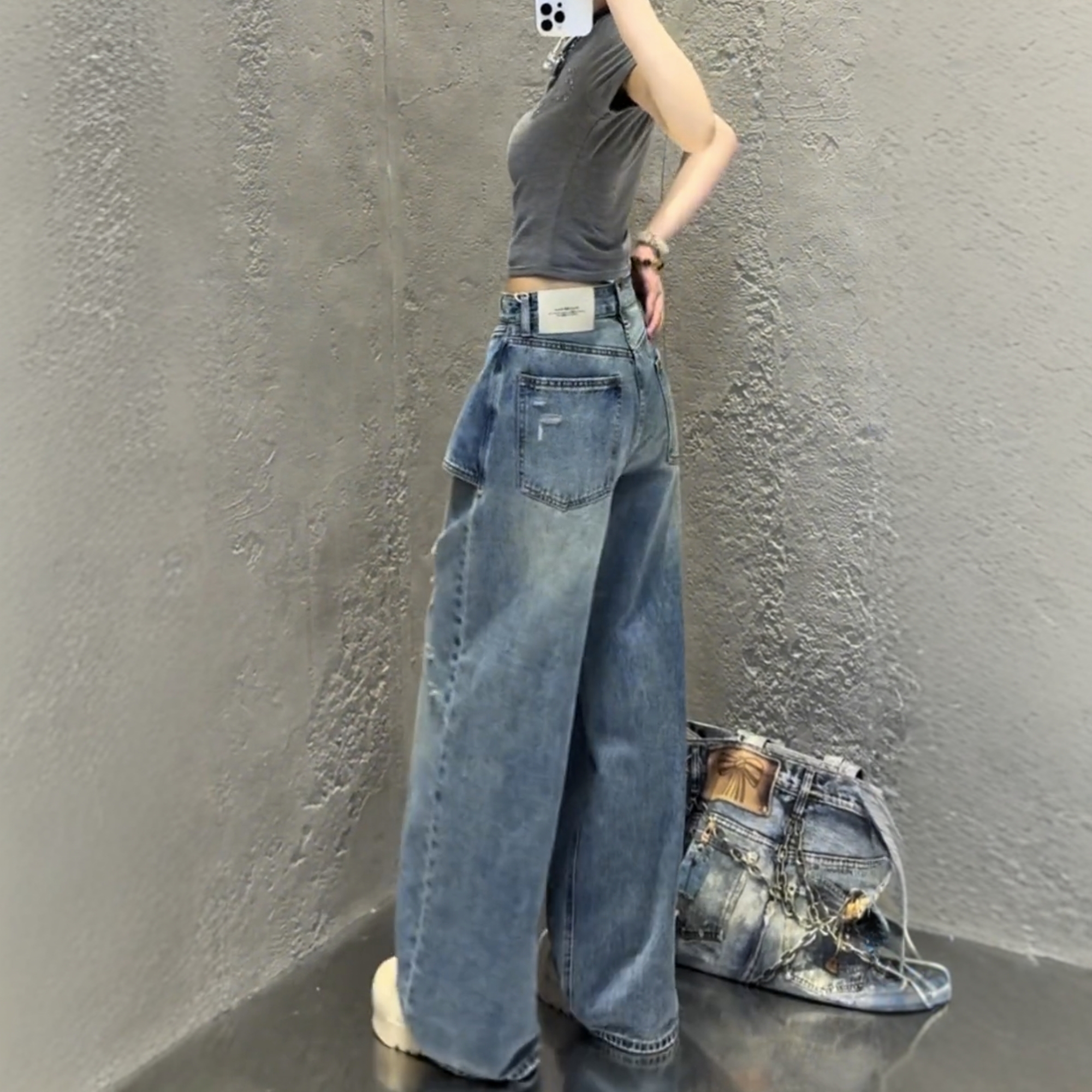 大码美式阔腿牛仔裤女新款胖mm显瘦破洞复古直筒梨型身材裤子 服裝批發女裝批發服飾貨源