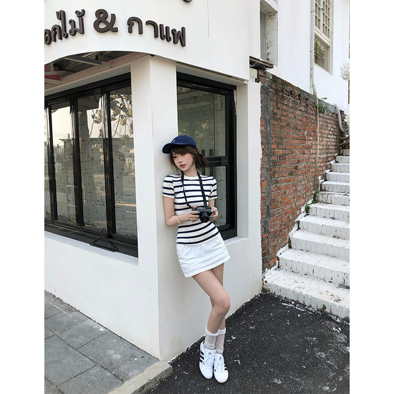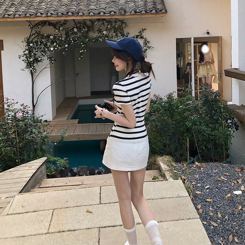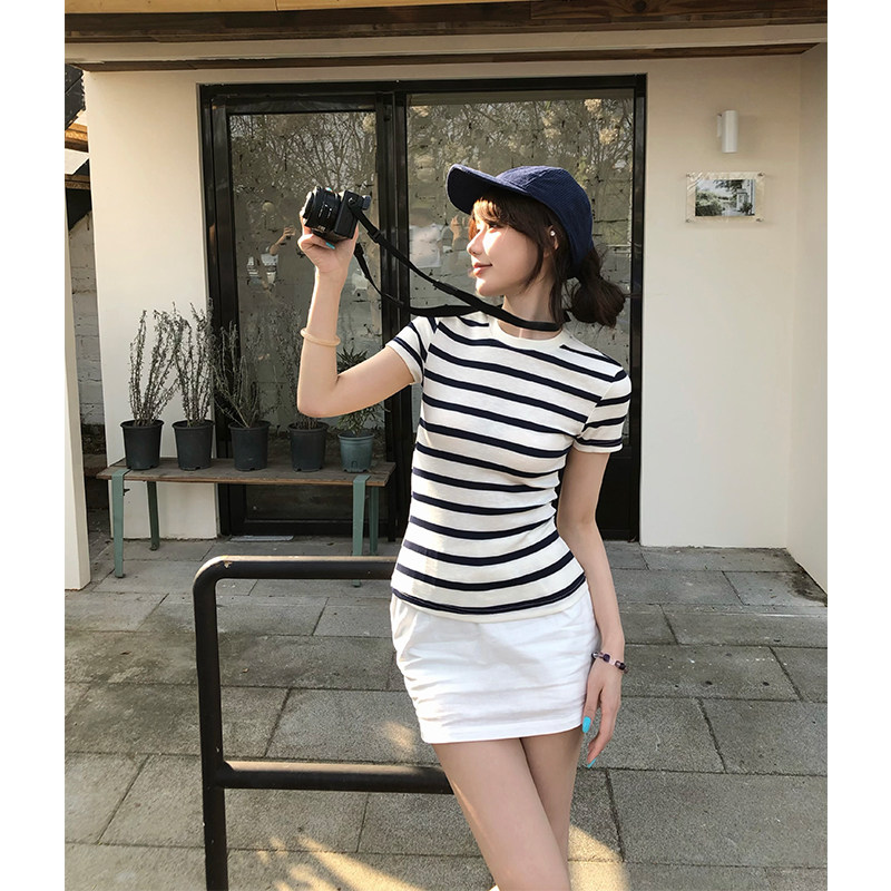 BY13701# 轻奢美式复古正肩上衣女夏休闲圆领条纹短袖辣妹修身显瘦T恤 服裝批發女裝批發服飾貨源