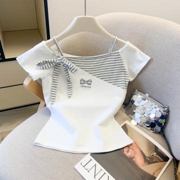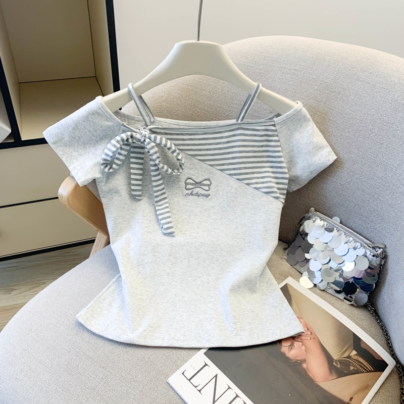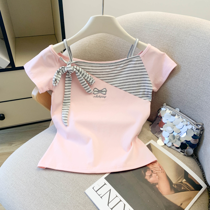 BY13733# 夏季修身显瘦小个子条纹刺绣拼接撞色短袖T恤女上衣 服裝批發女裝批發服飾貨源