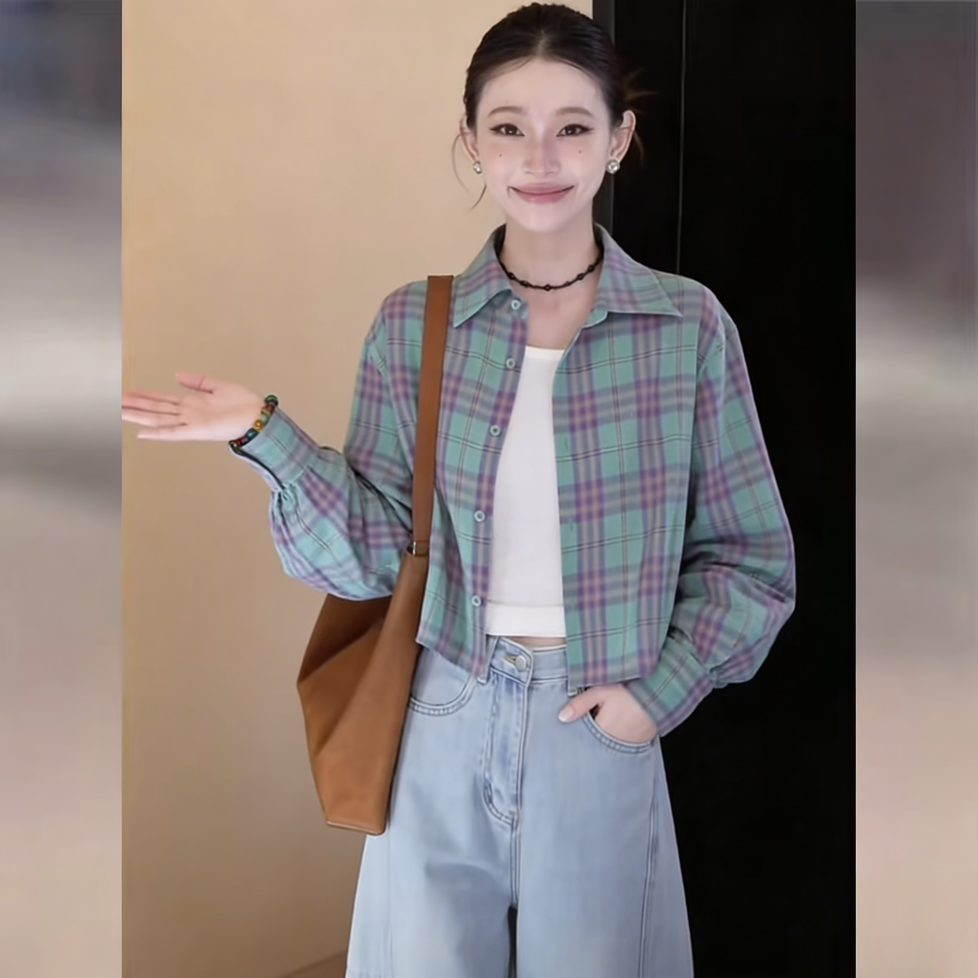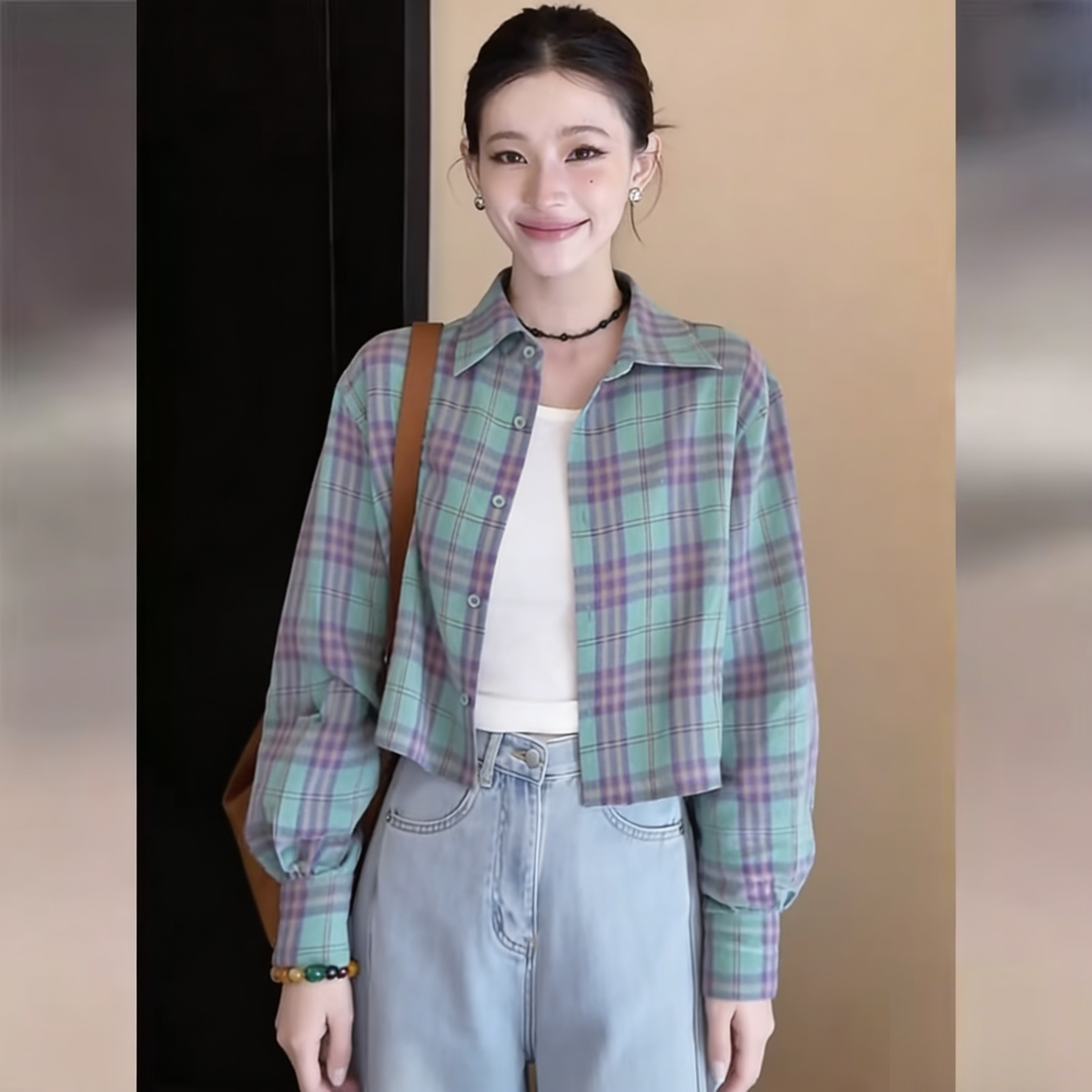 BY13769# 韩式新款格纹长袖短款长袖衬衫女春通勤百搭上衣 服裝批發女裝批發服飾貨源