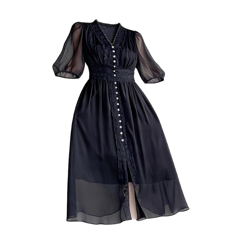 BY13776# 春夏新款超仙雪纺拼接蕾丝开衩法式修身显瘦高腰连衣裙长裙女 服裝批發女裝批發服飾貨源
