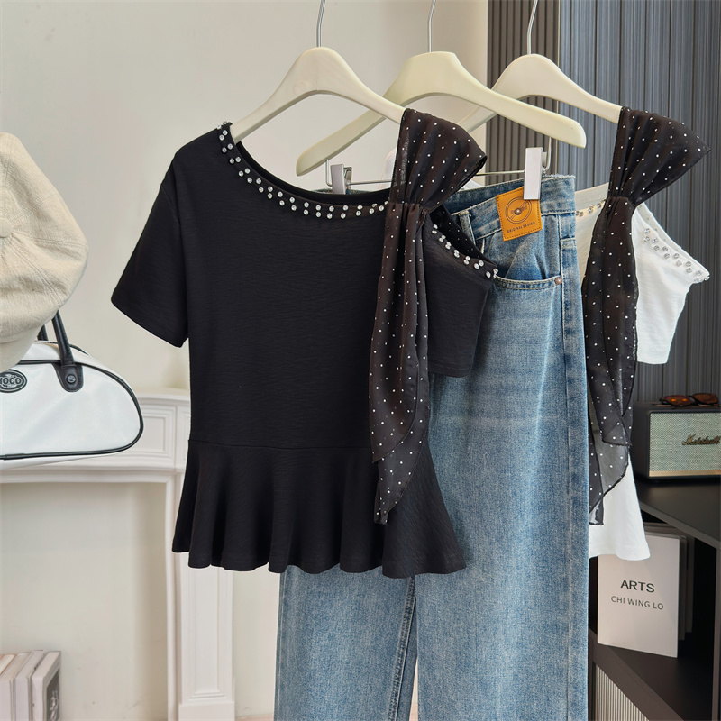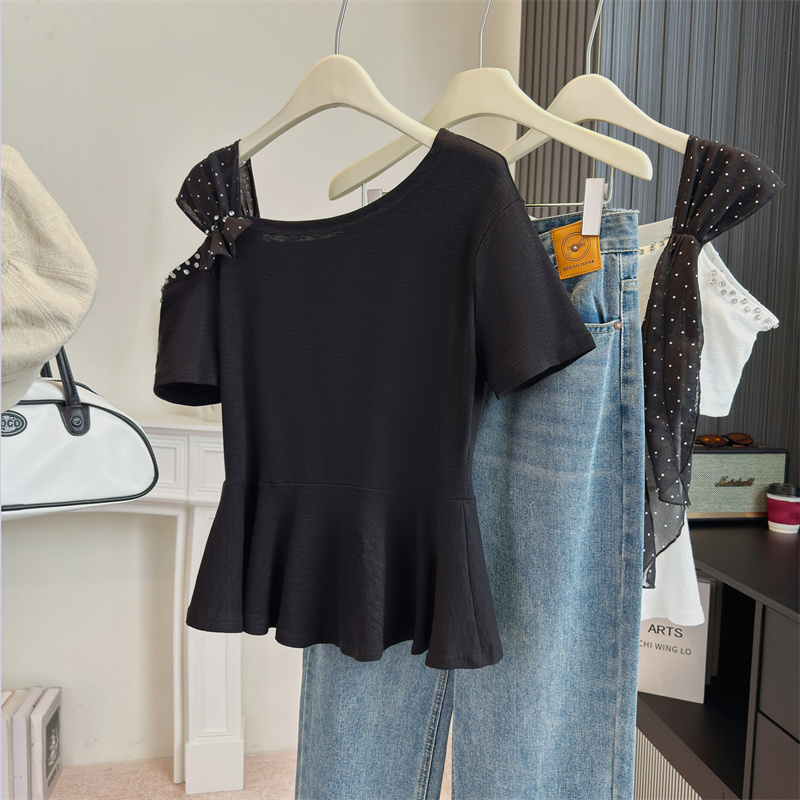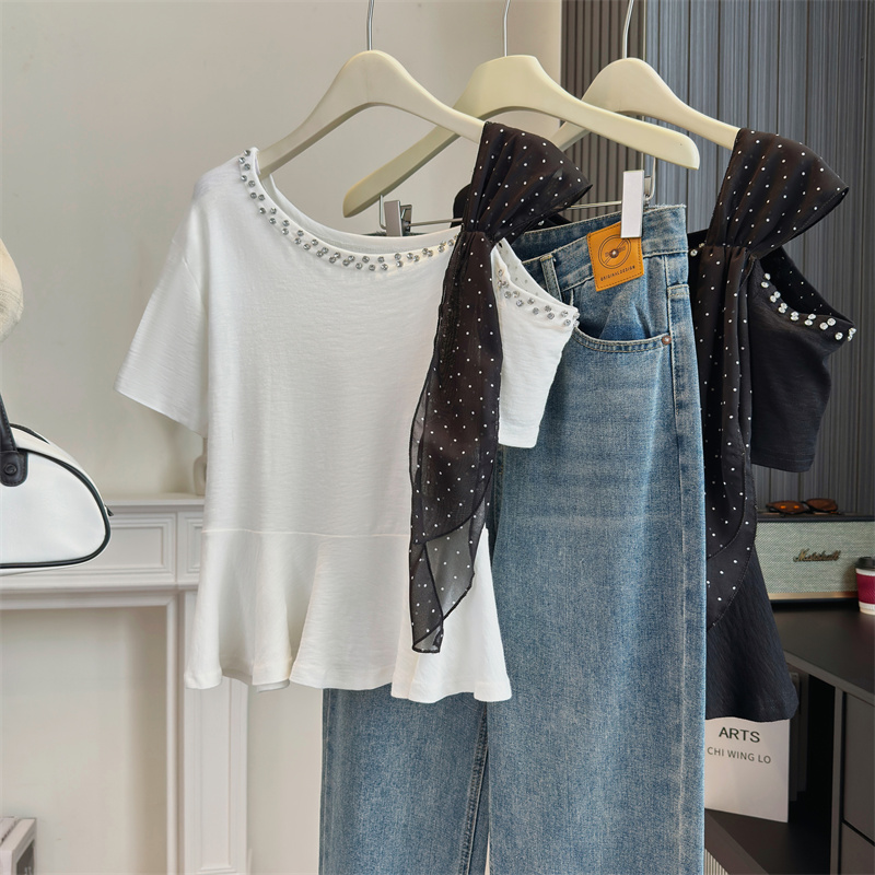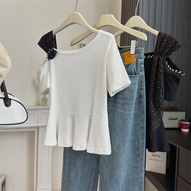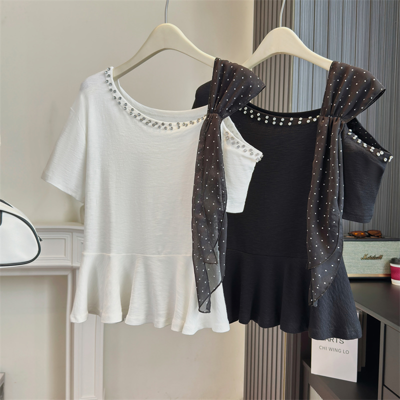 BY13800# 大码女装法式独特设计感斜肩重工钉钻波点飘带显瘦时尚上衣 服裝批發女裝批發服飾貨源
