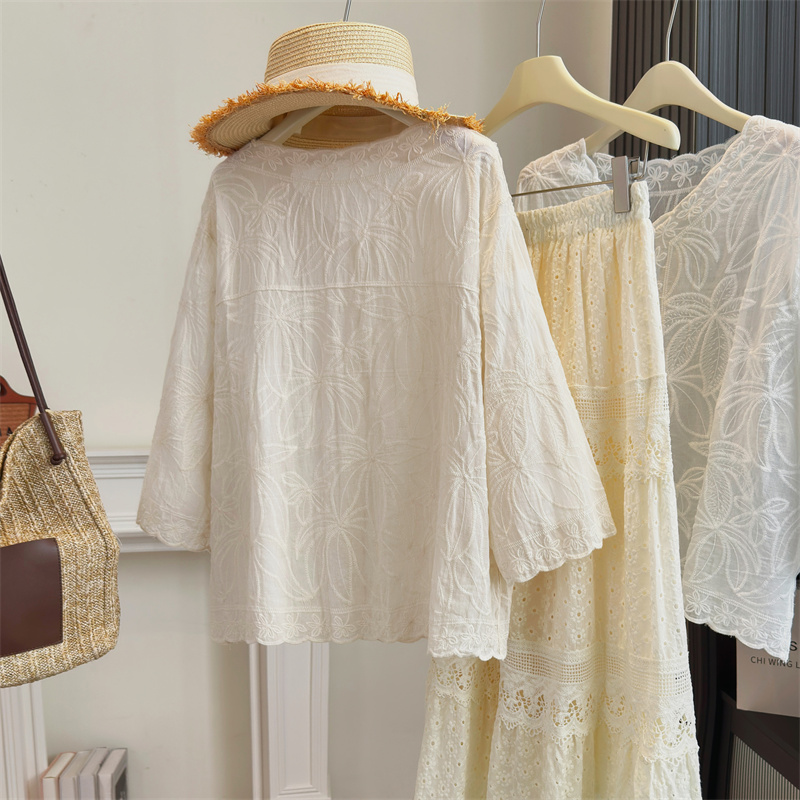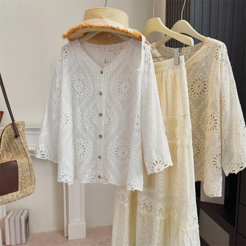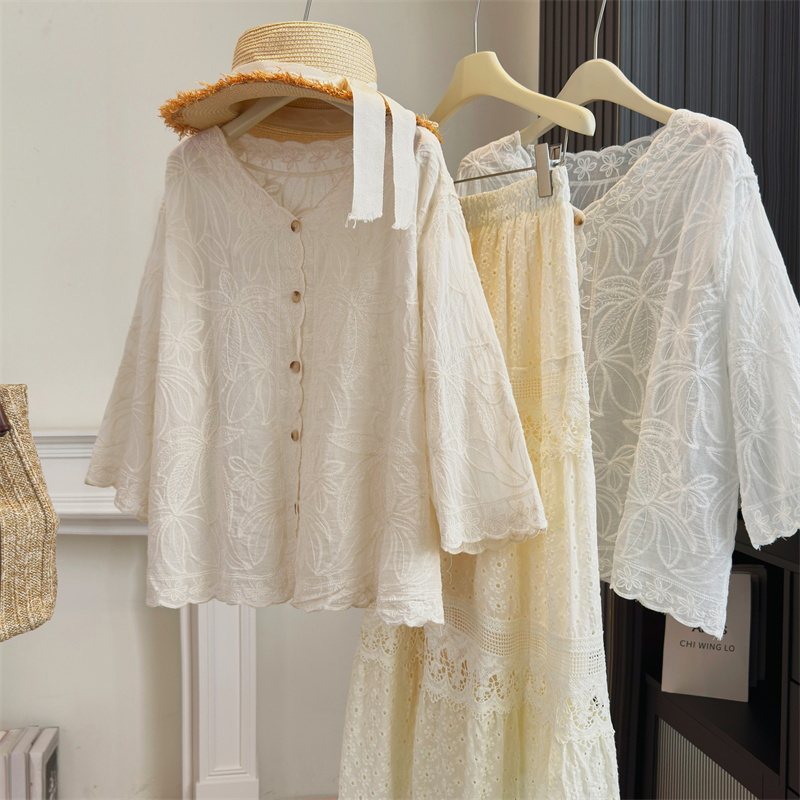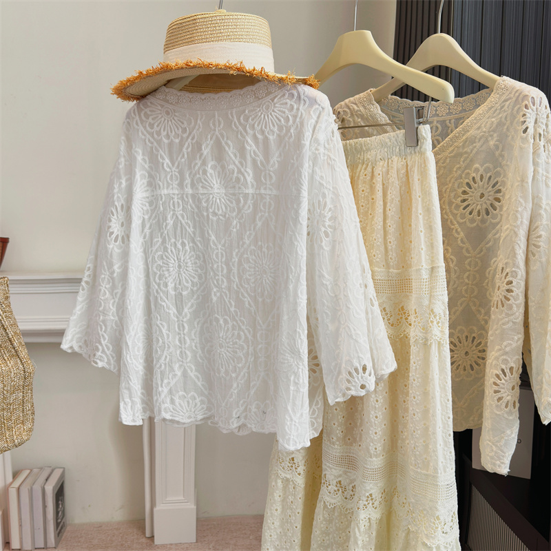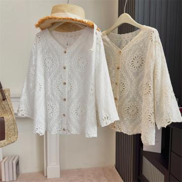BY13802# 大码女装法式蕾丝镂空刺绣V领百搭衬衫夏季新款显瘦防晒上衣 服裝批發女裝批發服飾貨源