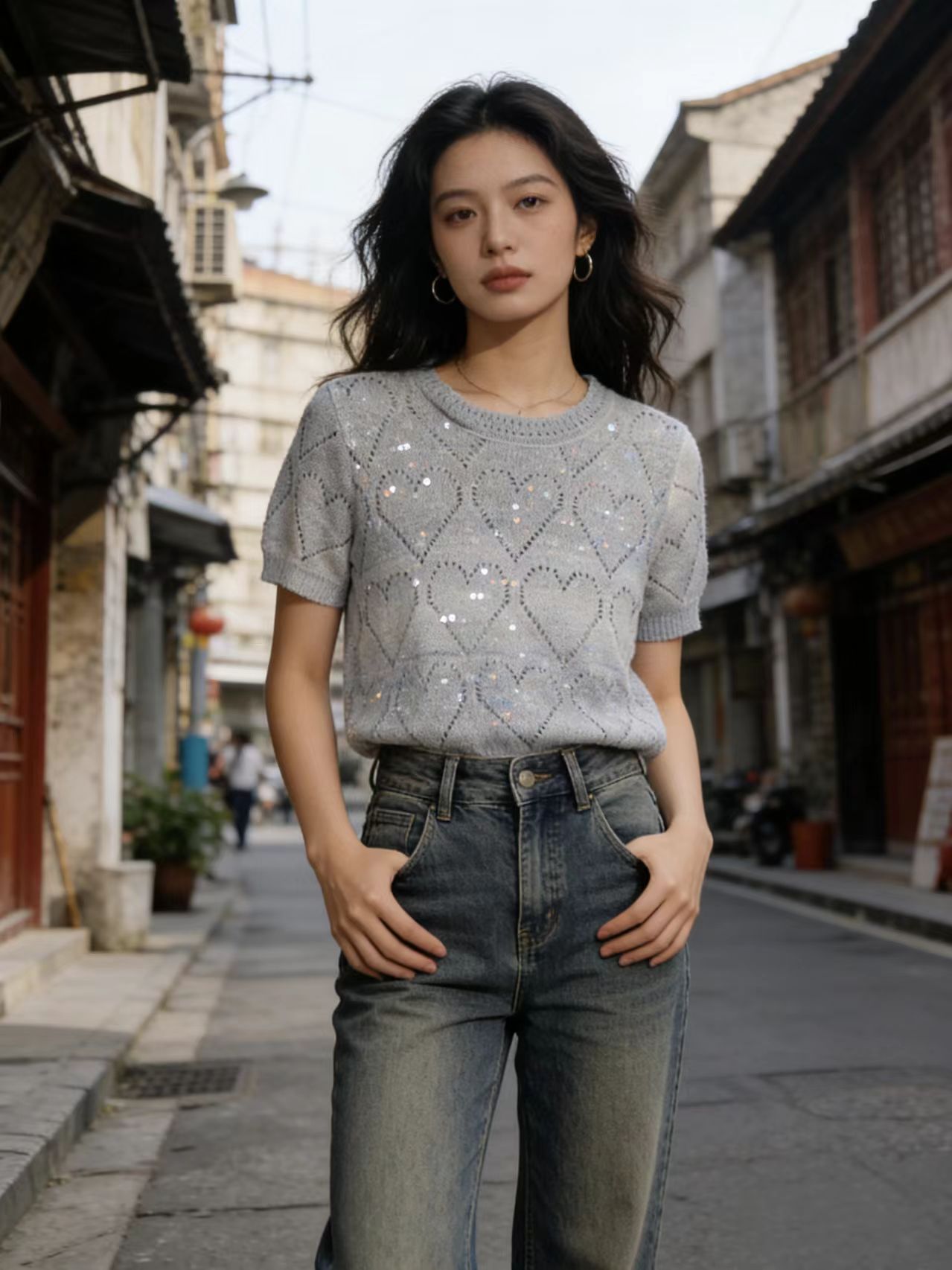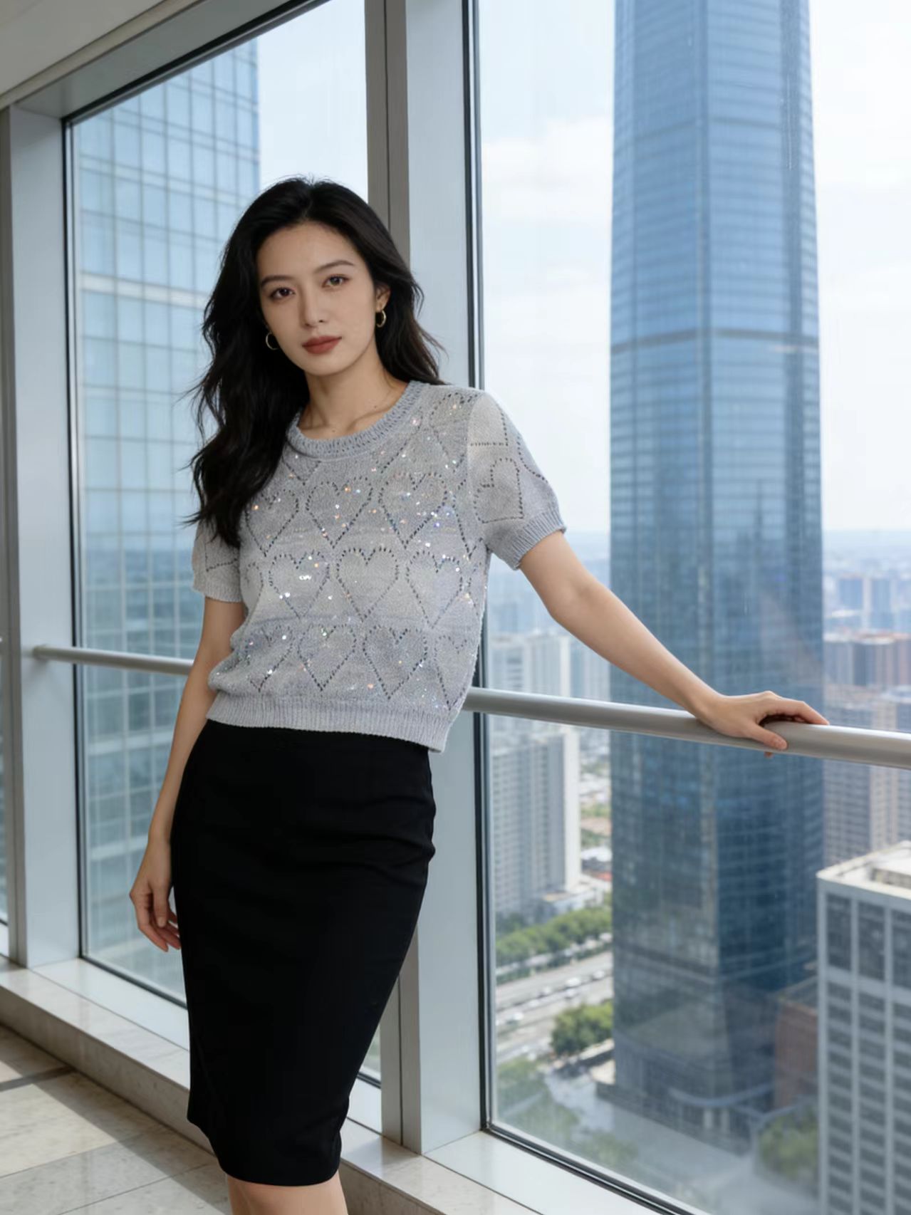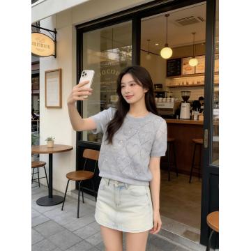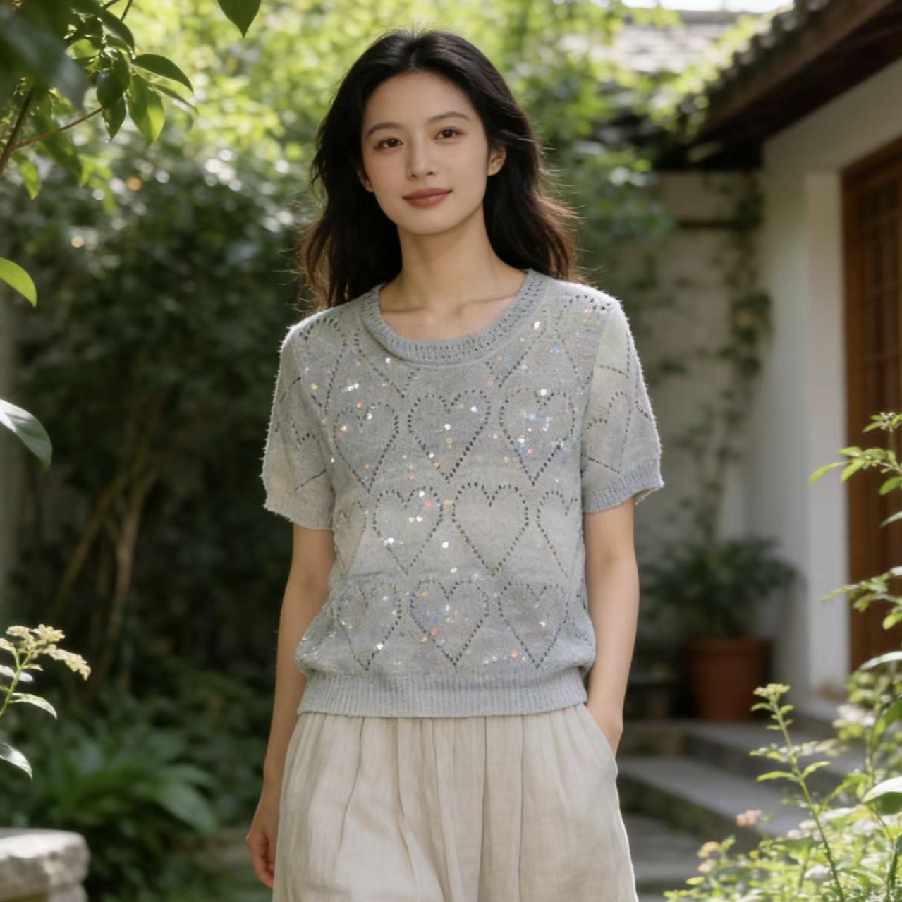 BY13803# 大码亮片镂空短袖针织衫女夏季休闲百搭冰丝圆领T恤上衣 服裝批發女裝批發服飾貨源