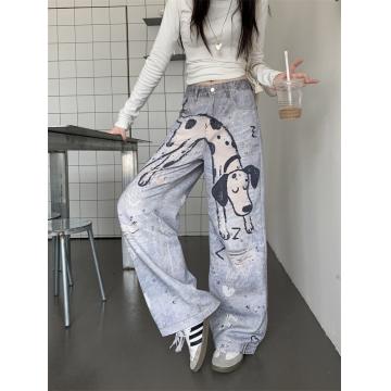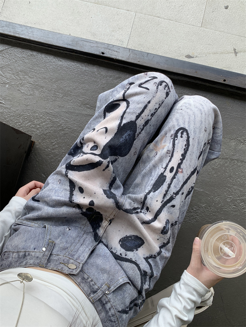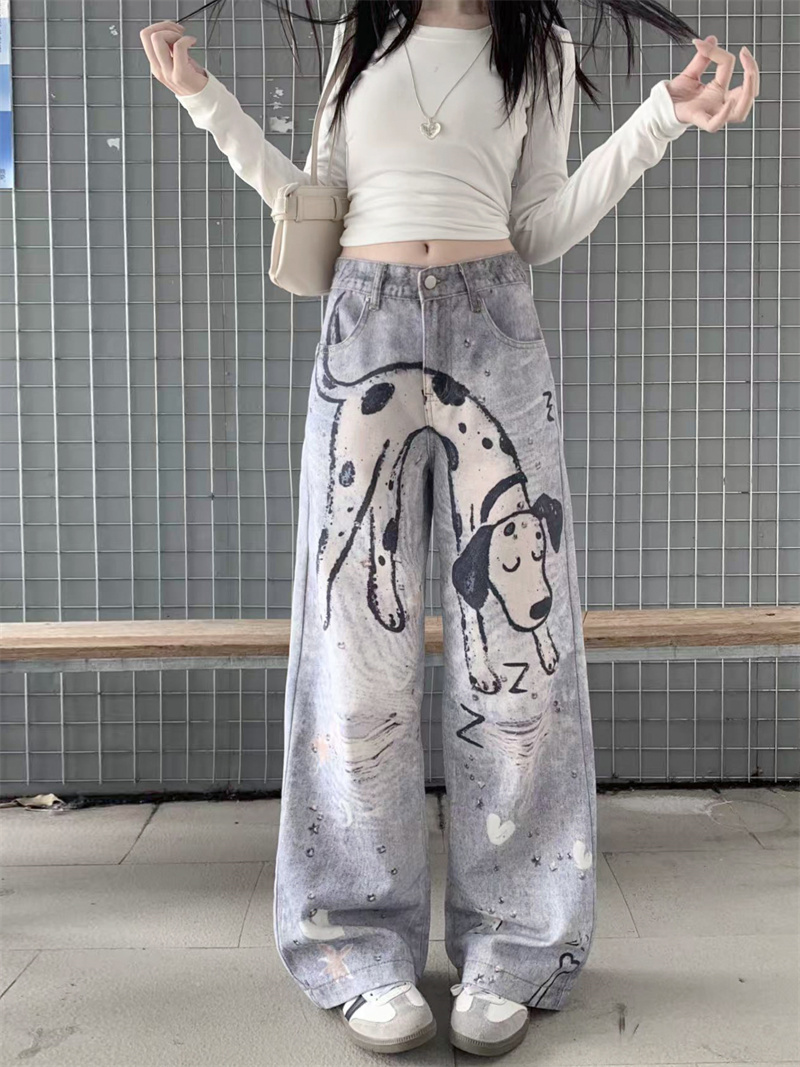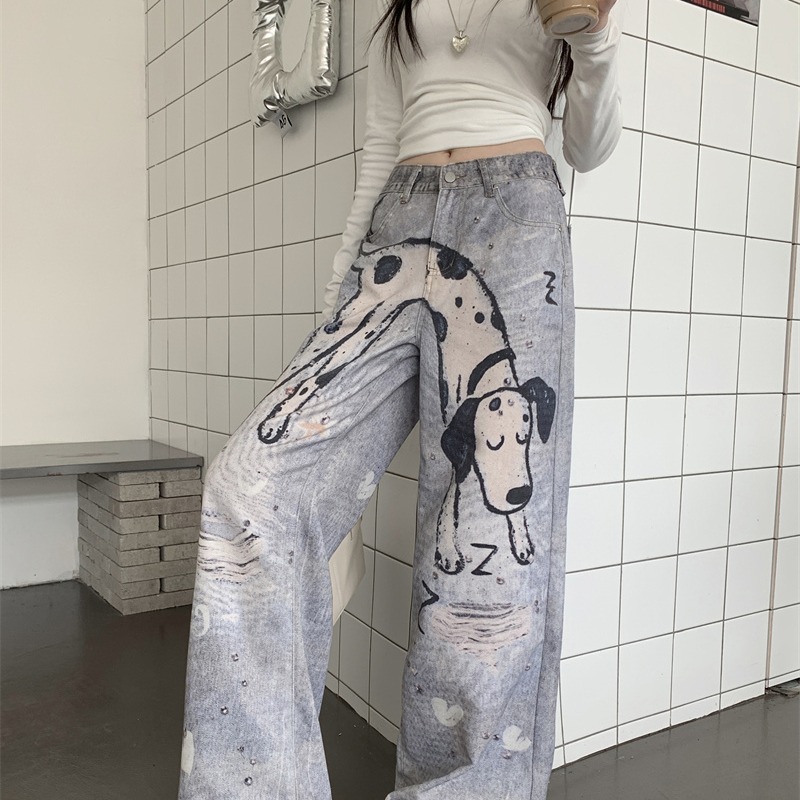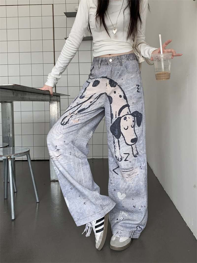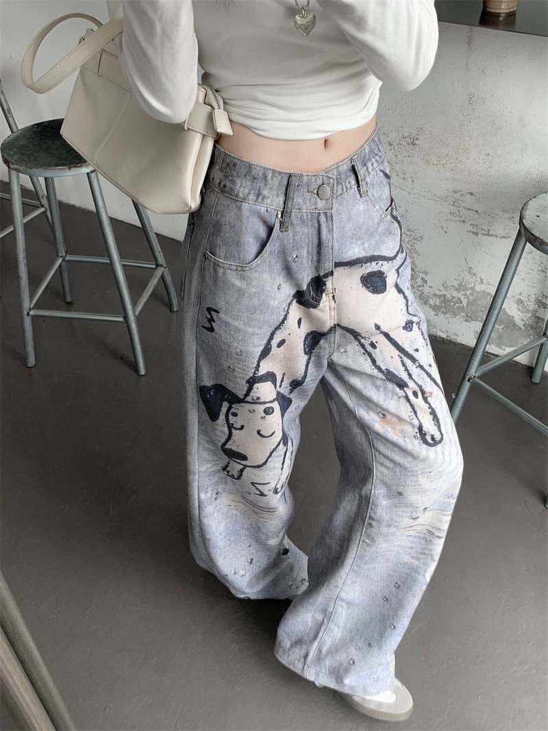 BY13830# 小众设计感手绘斑点狗牛仔裤碎钻打印直筒裤 服裝批發女裝批發服飾貨源