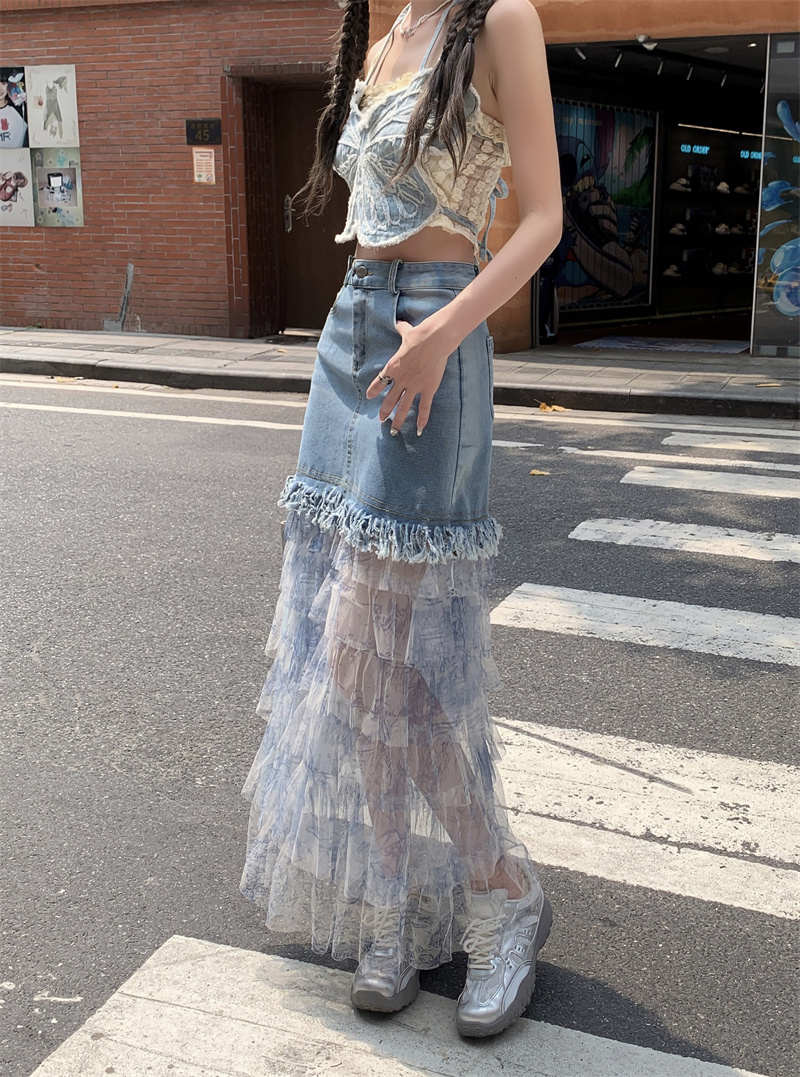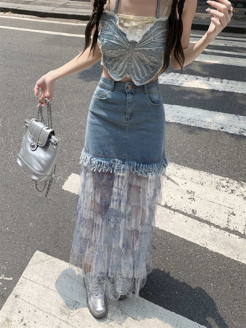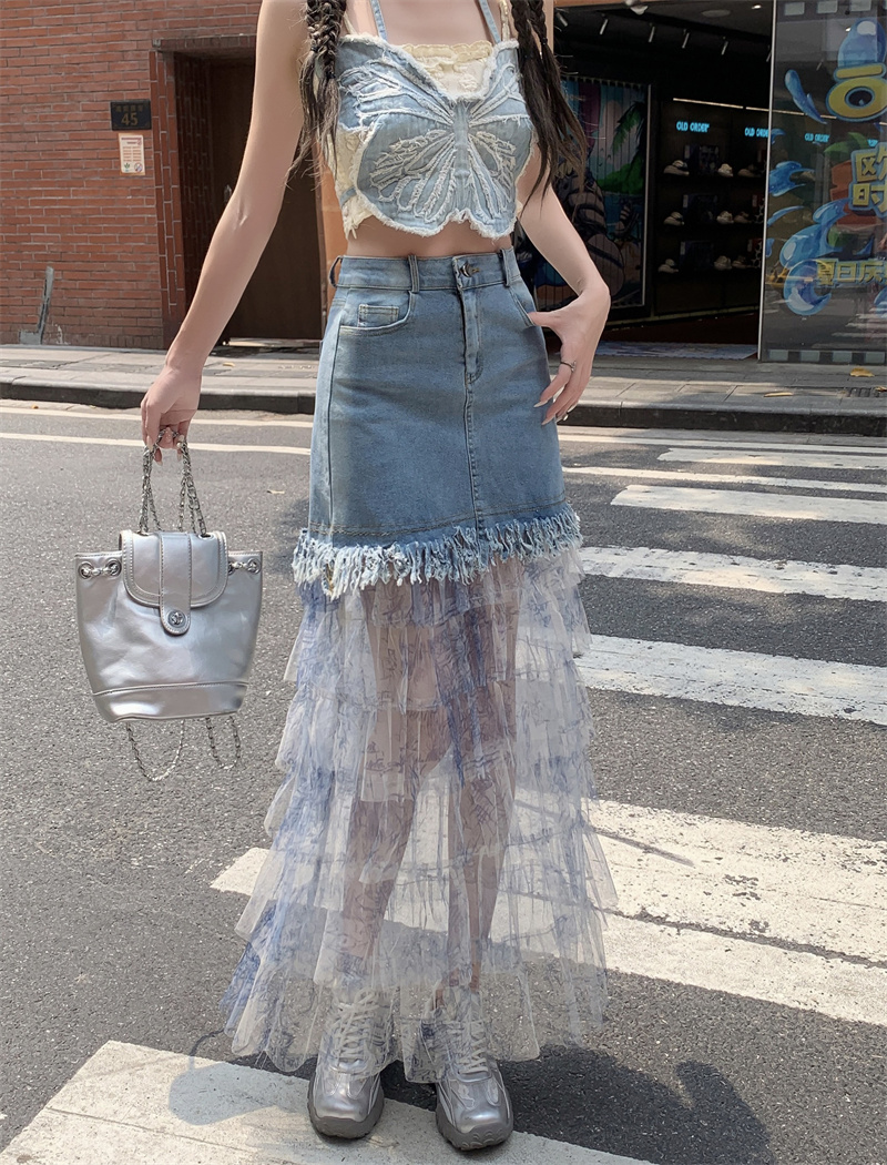 BY13831# 春夏新款拼接网纱蛋糕牛仔半身裙女高腰拼接网纱长裙子 服裝批發女裝批發服飾貨源