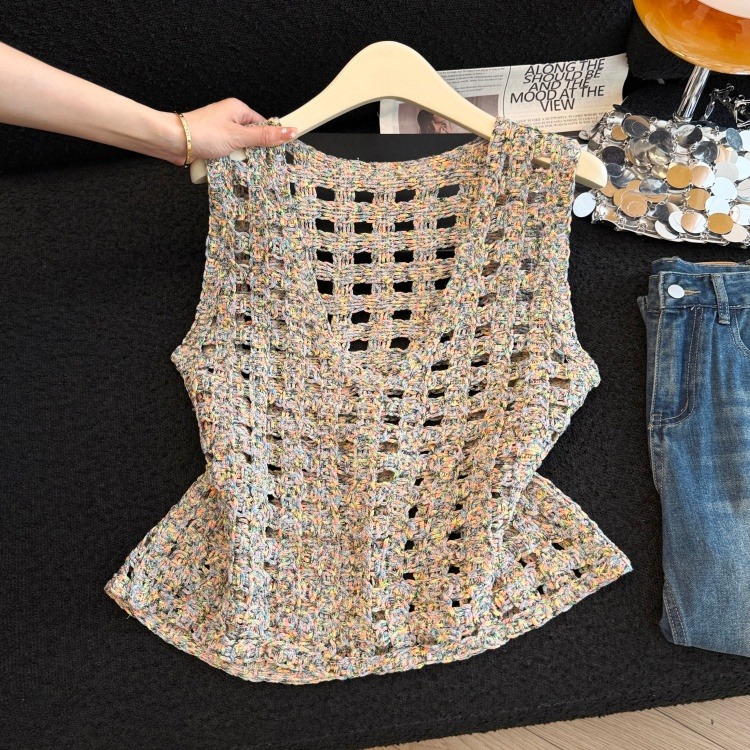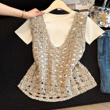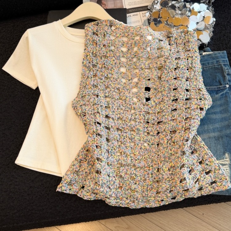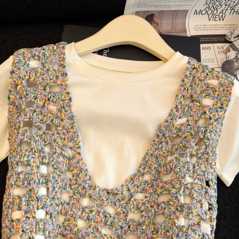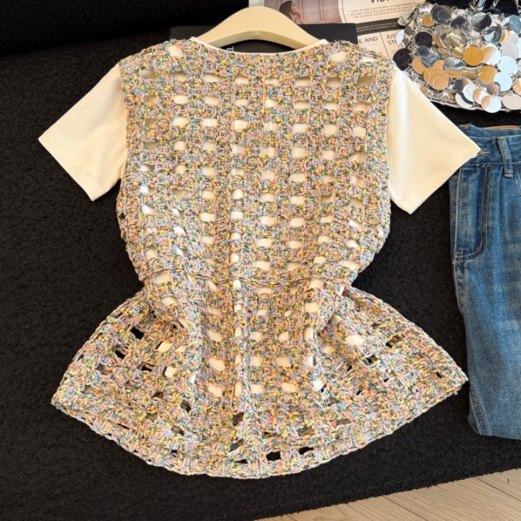 BY13850# 夏季新款圆领短袖T恤钩花镂空背心两件套洋气减龄套装女 服裝批發女裝批發服飾貨源
