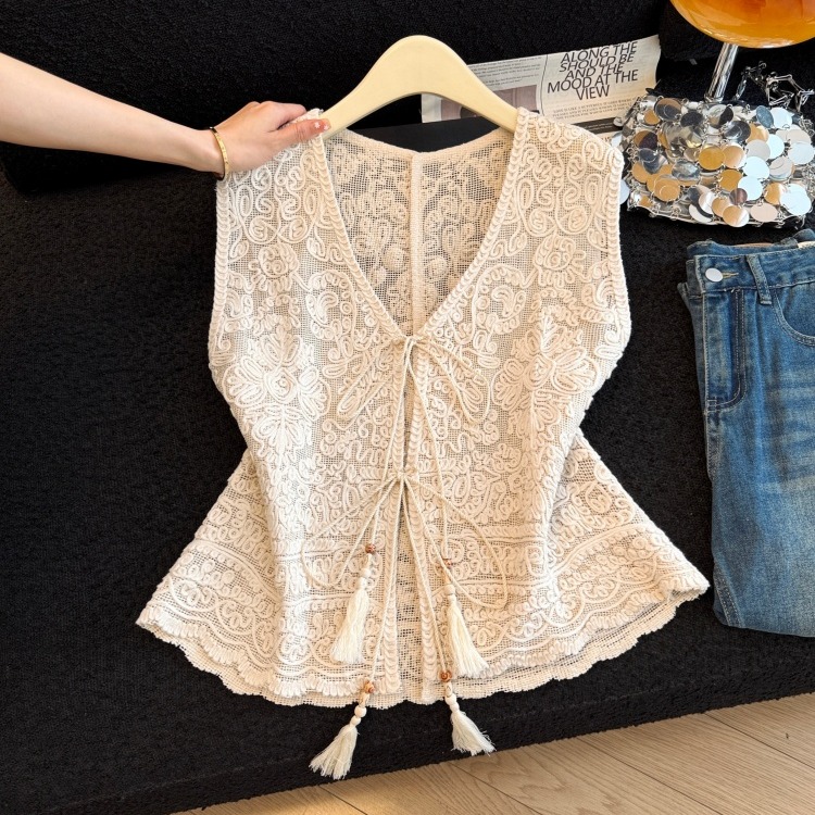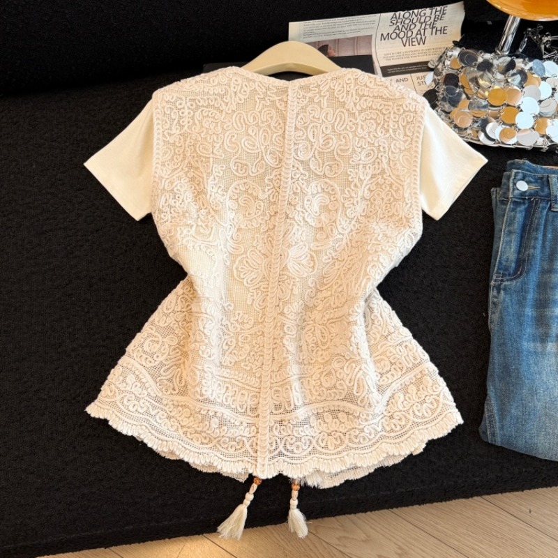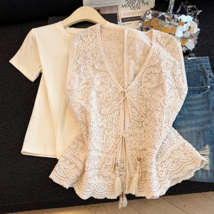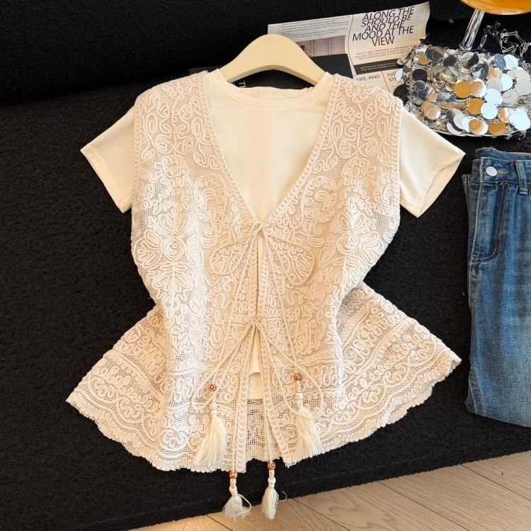 BY13853# 夏季新款钩花镂空重工刺绣系带马甲百搭短袖两件套 服裝批發女裝批發服飾貨源