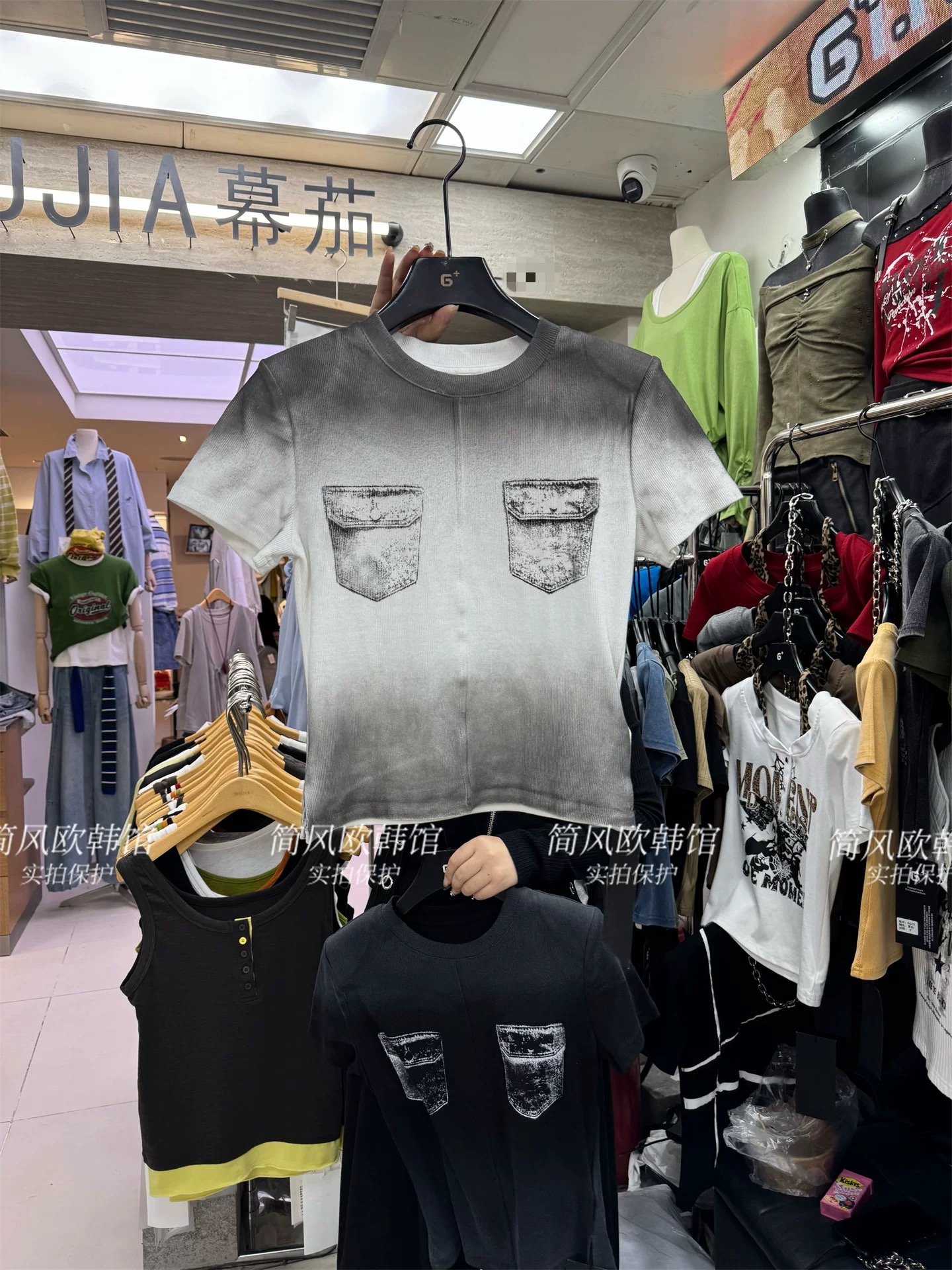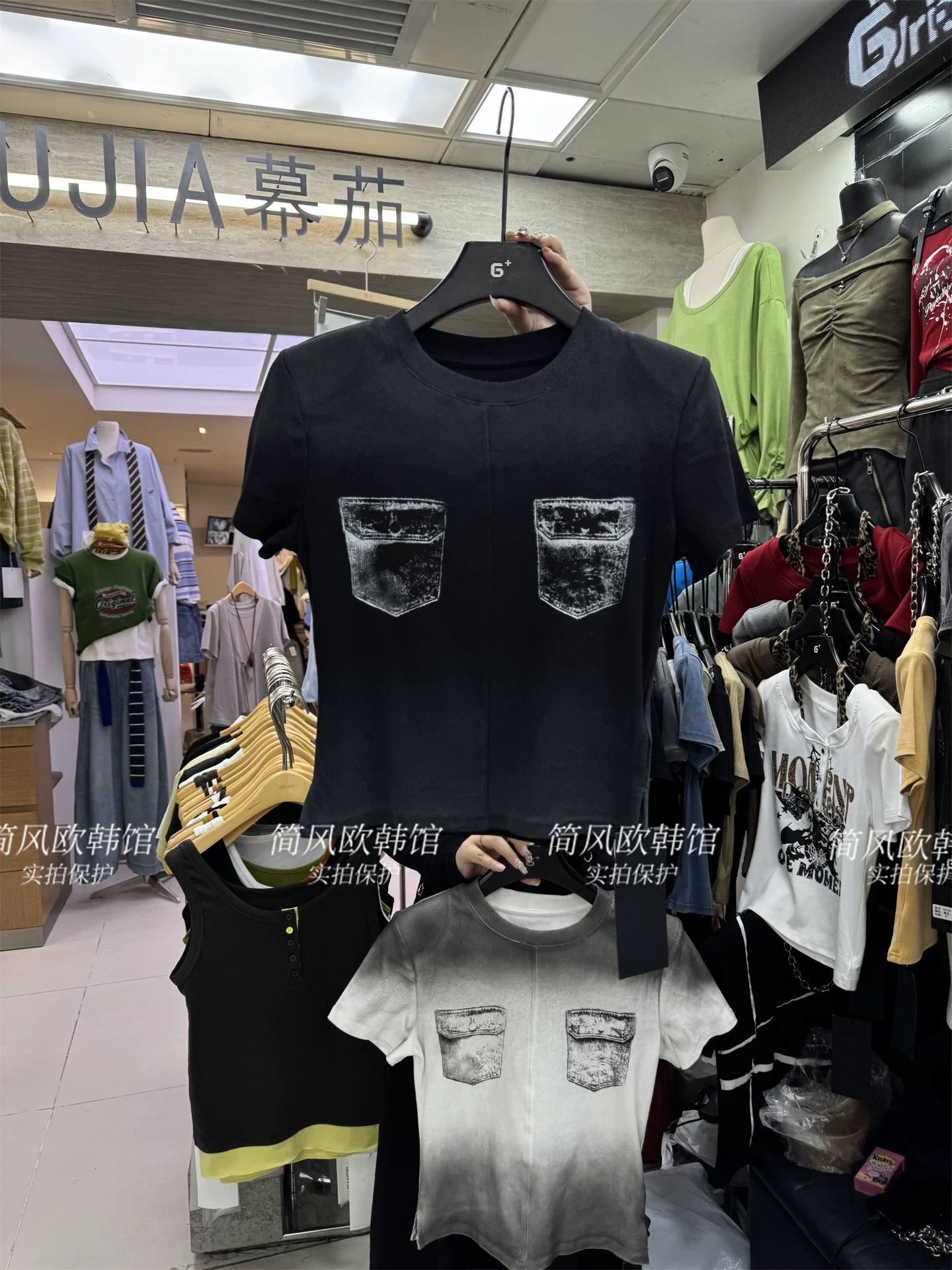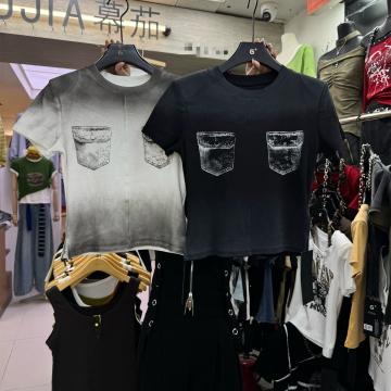 BY13862# 美式复古个性辣妹水洗喷绘假口袋短款短袖螺纹棉T恤上衣t 服裝批發女裝批發服飾貨源