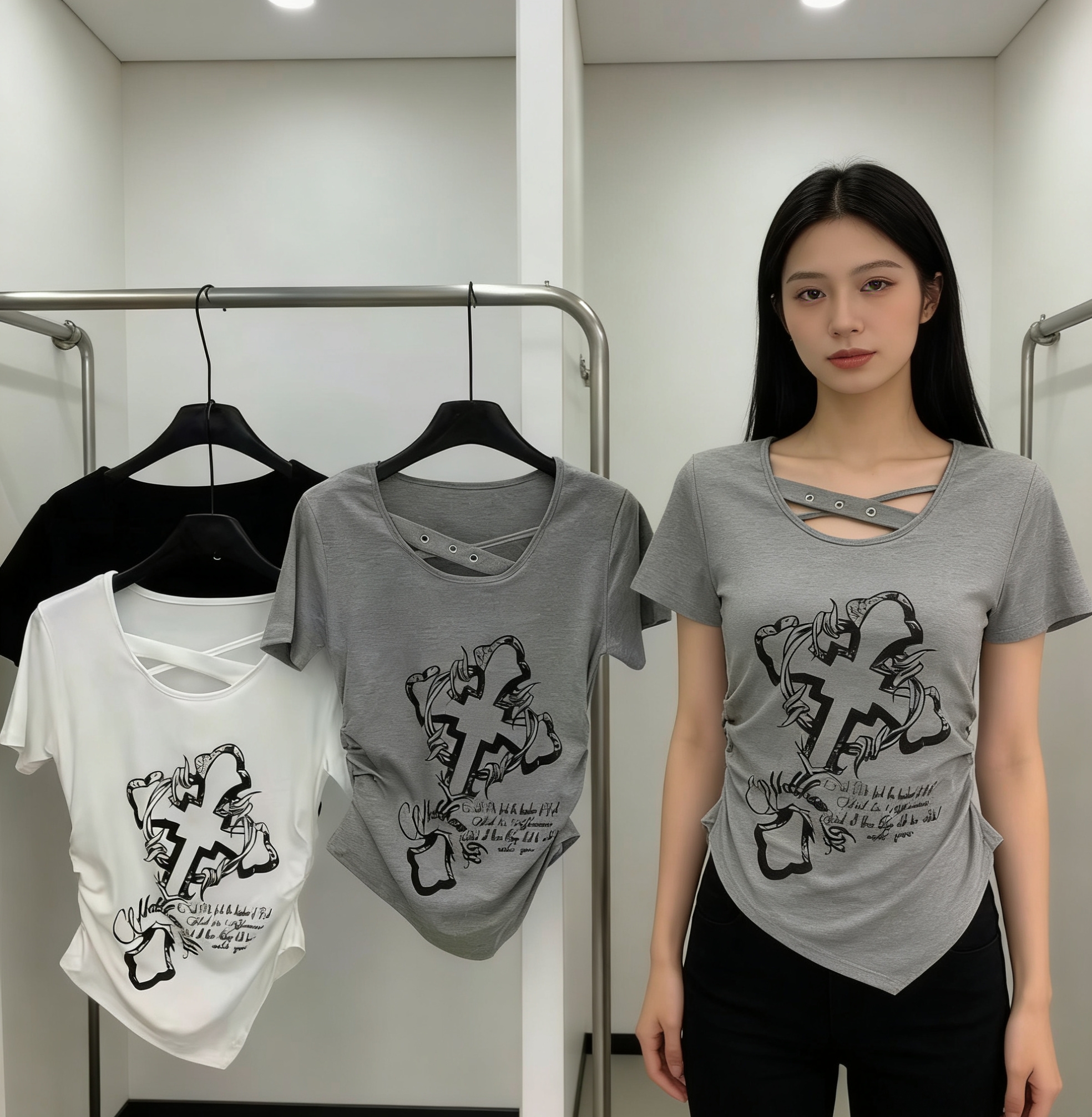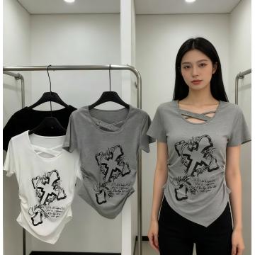 BY13865# 韩版甜酷十字架印花短袖T恤侧边褶皱显瘦不规则下摆上衣 服裝批發女裝批發服飾貨源