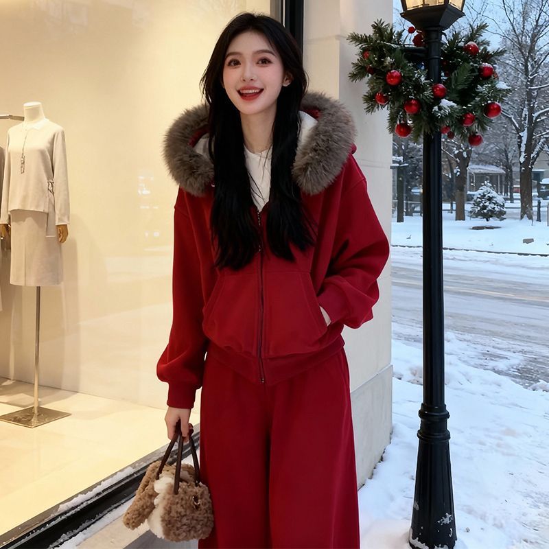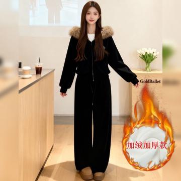 LN76438# 时尚休闲运动套装女秋冬加绒连帽卫衣外套阔腿裤子一整套
