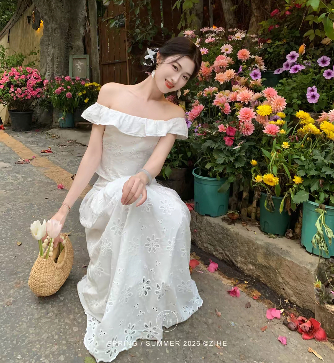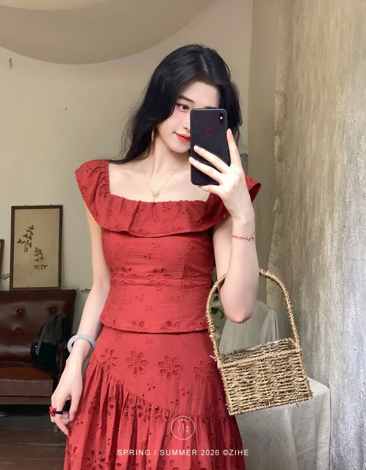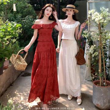 LN76441#凌茜恣禾花影镂白国风新中式镂空绣花飞边上衣绣花半身裙裙子