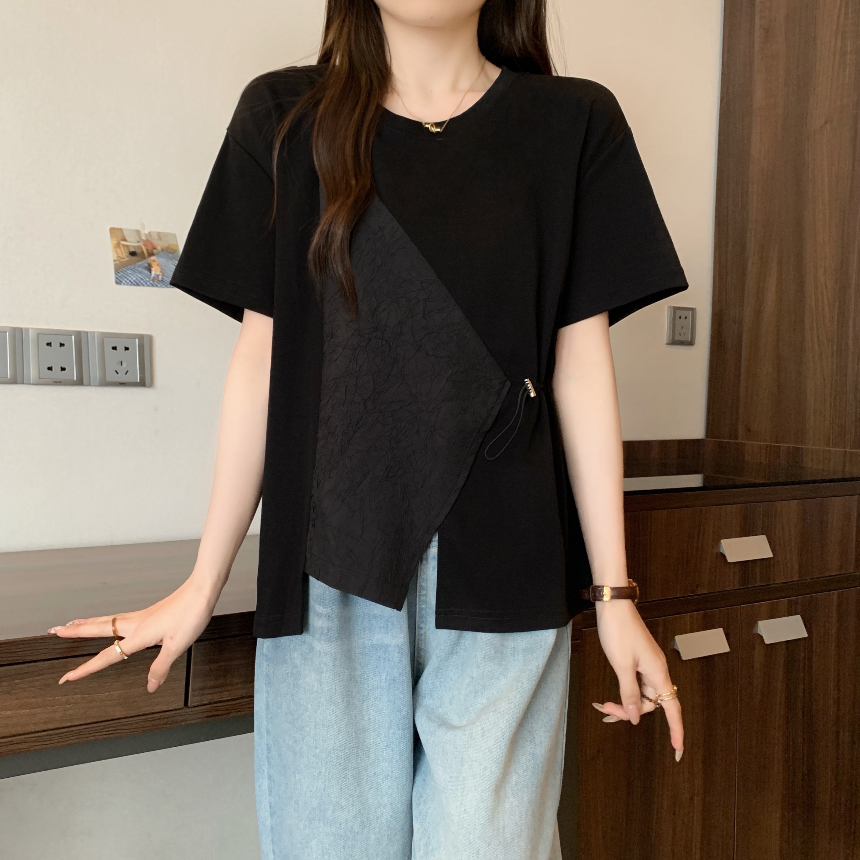 BY13961# 大码女装抽绳收腰t恤女短袖新款宽松不规则拼接设计感上衣 服裝批發女裝批發服飾貨源