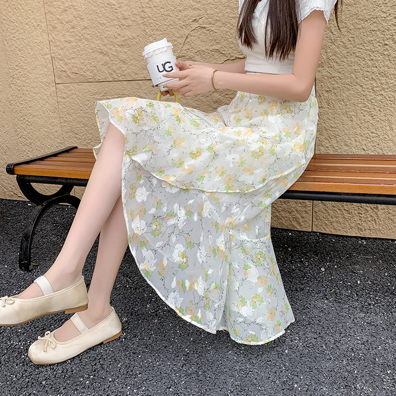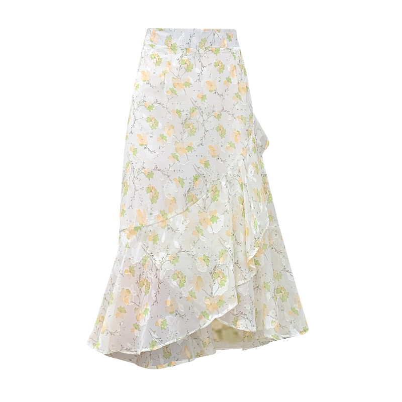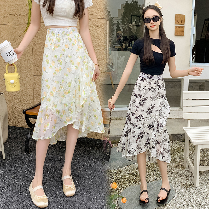 不规则碎花半身裙女高腰中长款雪纺裙橡筋腰鱼尾裙荷叶边裙子 服裝批發女裝批發服飾貨源