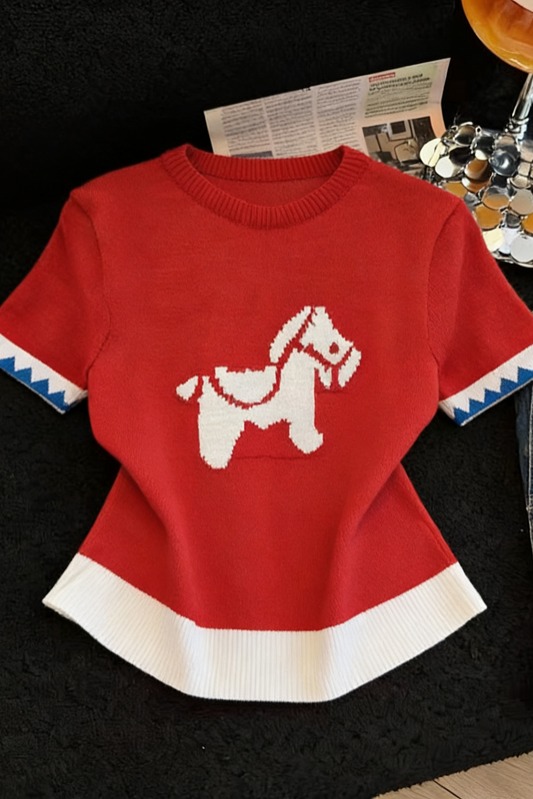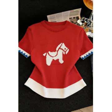 红色小马驹提花内搭打底针织短袖t恤女本命年马年上衣 服裝批發女裝批發服飾貨源