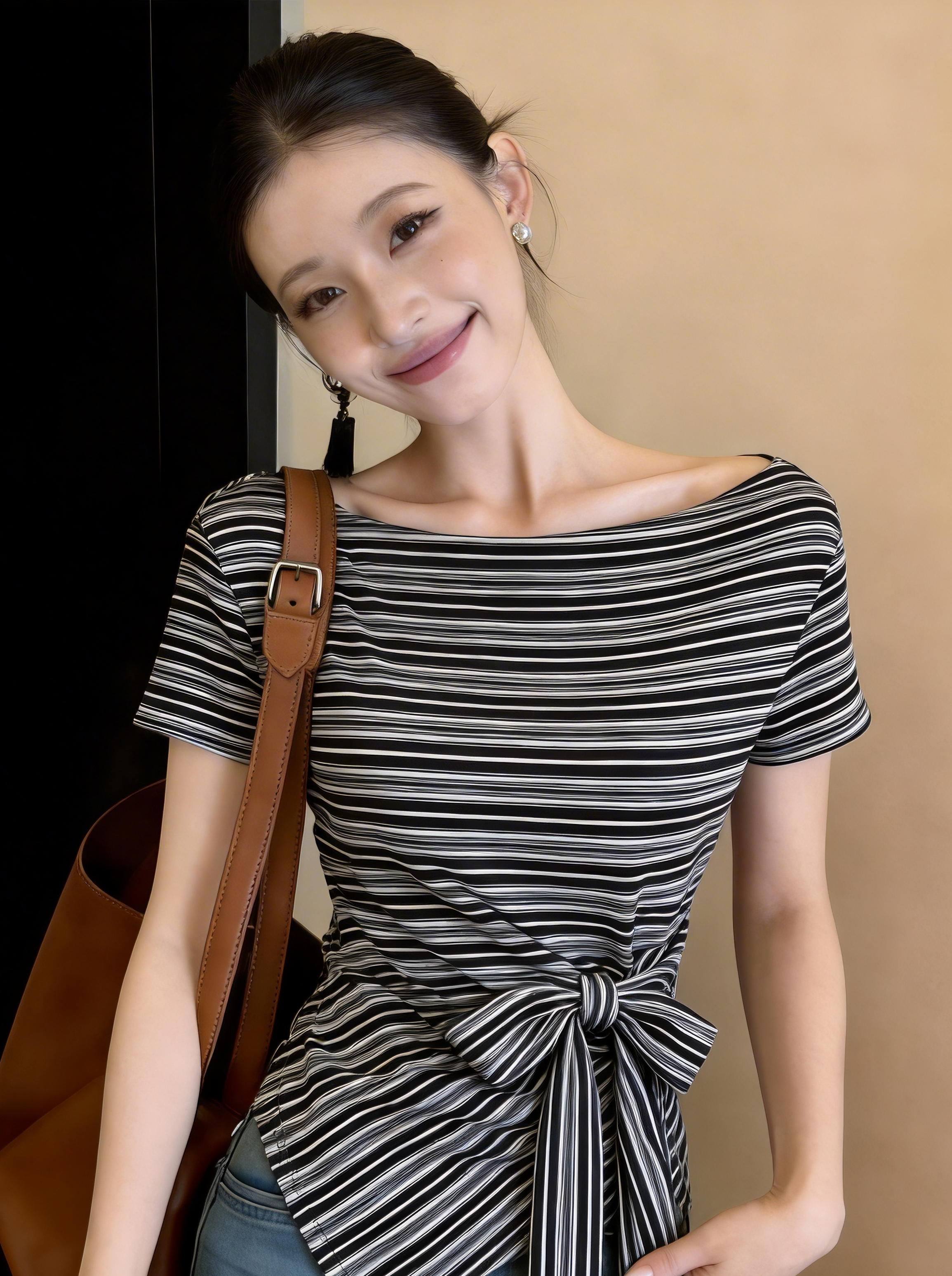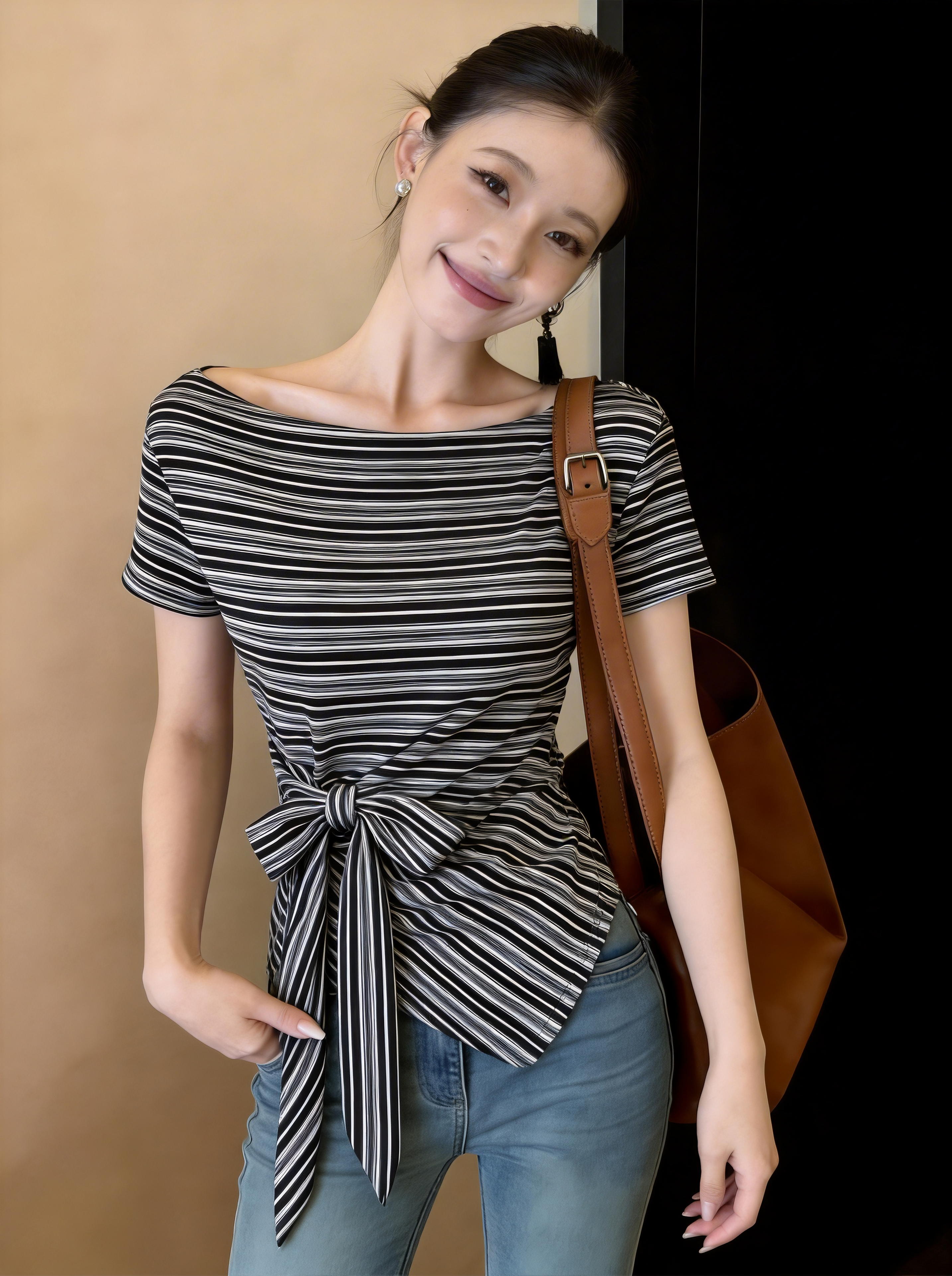 BY14074# 夏季新款韩版简约一字领条纹侧开叉绑带弹力短袖T恤上衣女 服裝批發女裝批發服飾貨源