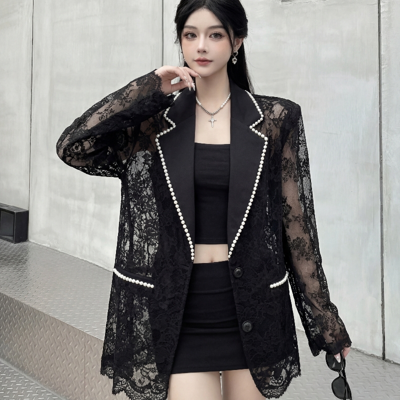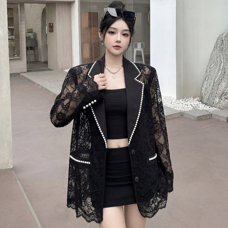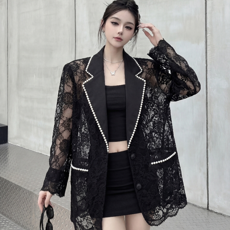 BY14113# 高级感珍珠蕾丝拼接垫肩款西装夏季镂空气质显瘦西服外套 服裝批發女裝批發服飾貨源