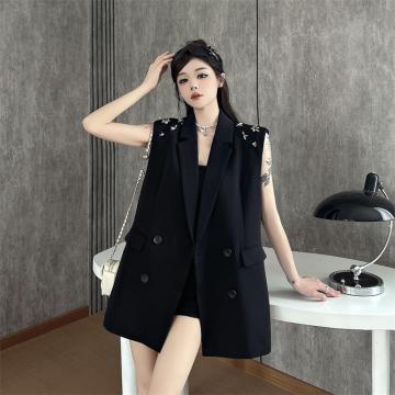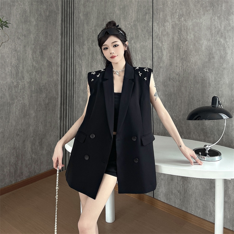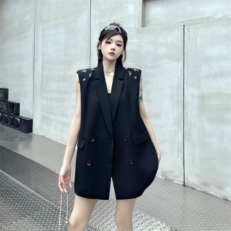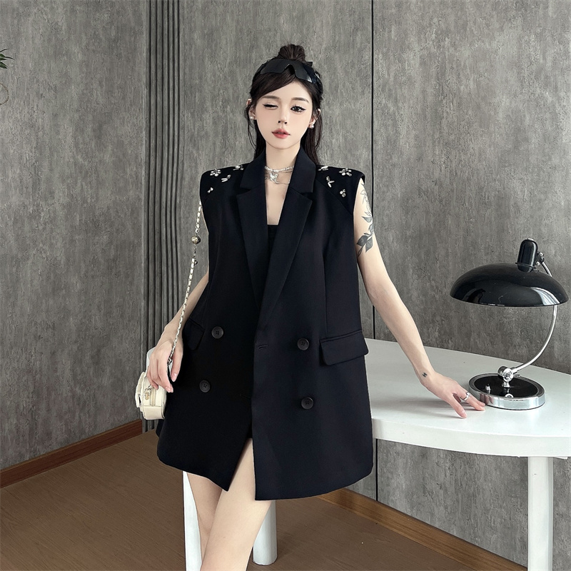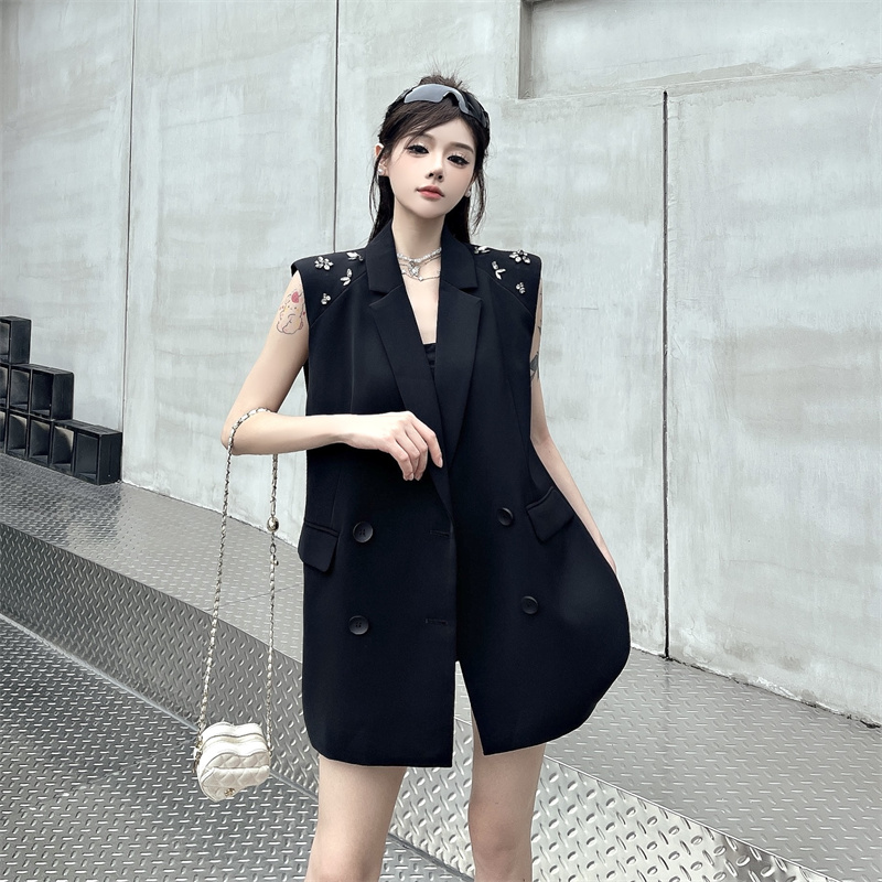 BY14115# 新款干练通勤风西装领钉钻双排扣马夹女宽松中长上衣 服裝批發女裝批發服飾貨源