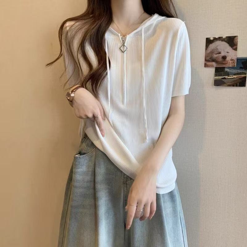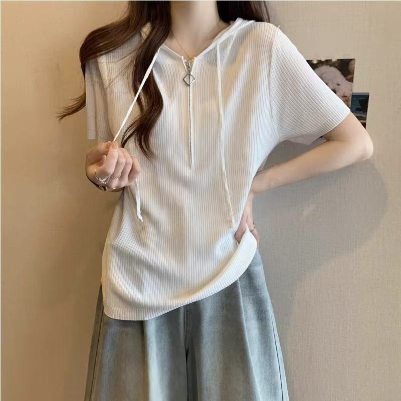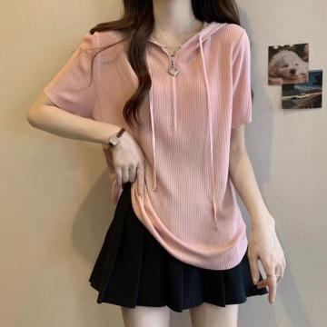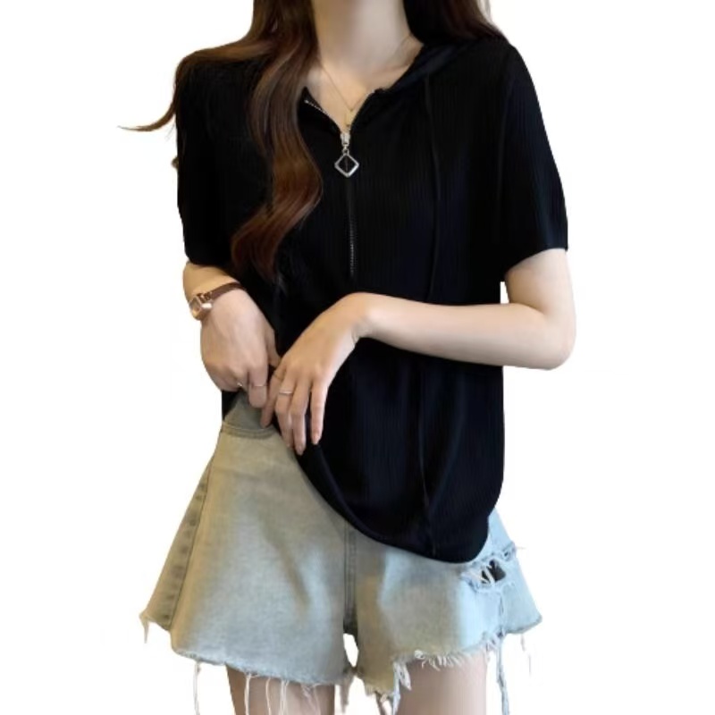 BY14268# 大码韩版拉链遮肚子短袖冰丝针织衫夏季胖妹妹显瘦正肩连帽打底衫 服裝批發女裝批發服飾貨源