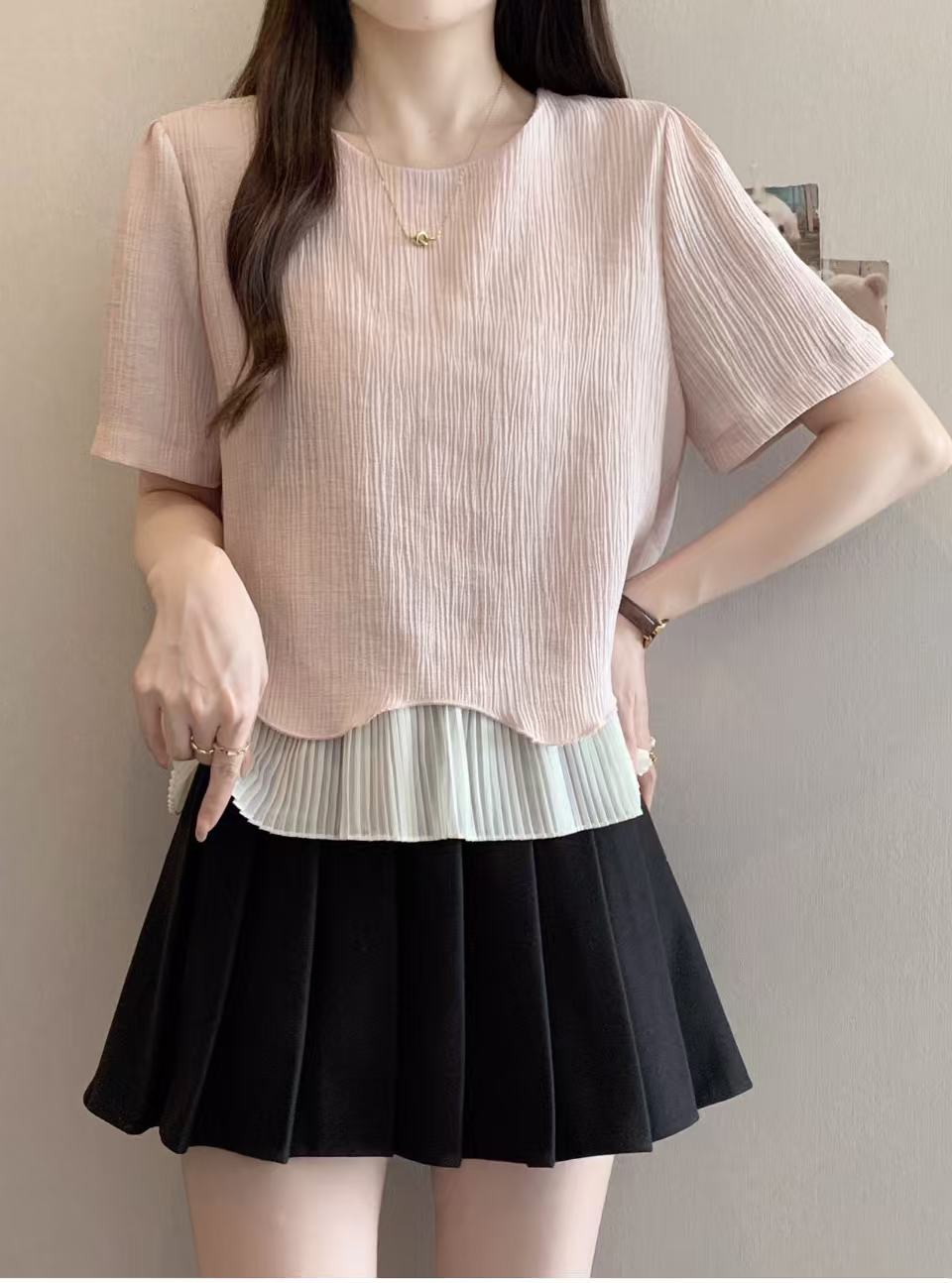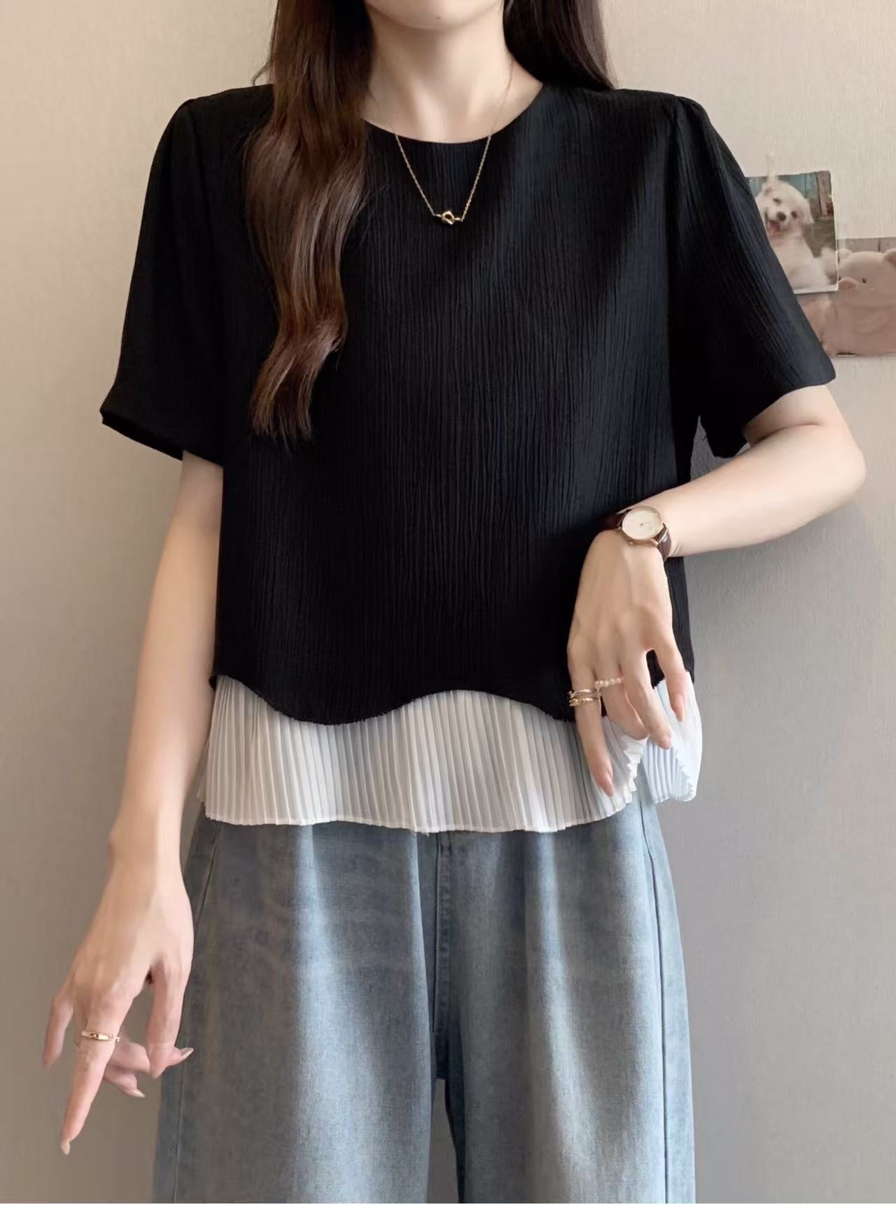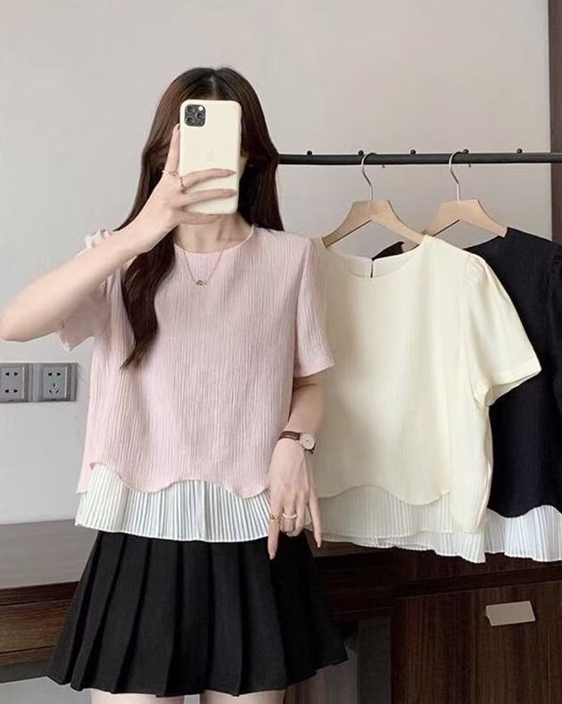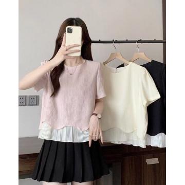 BY14269# 大码夏季新款胖MM宽松韩系温柔百搭拼接波浪下摆短袖T恤上衣 服裝批發女裝批發服飾貨源