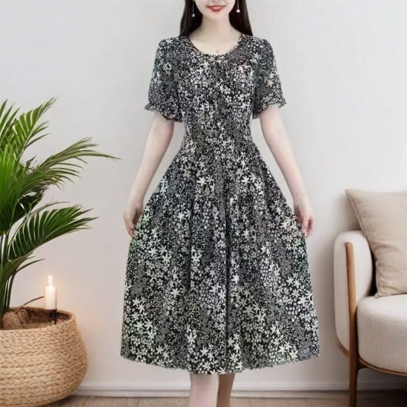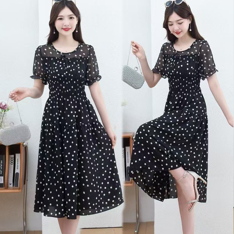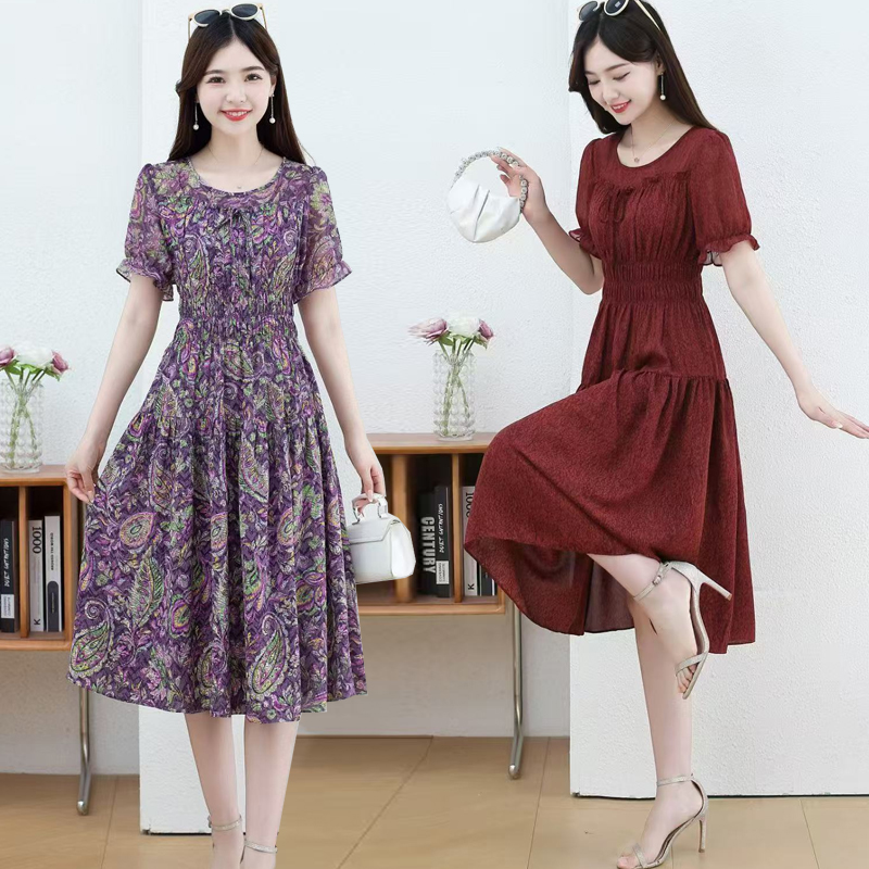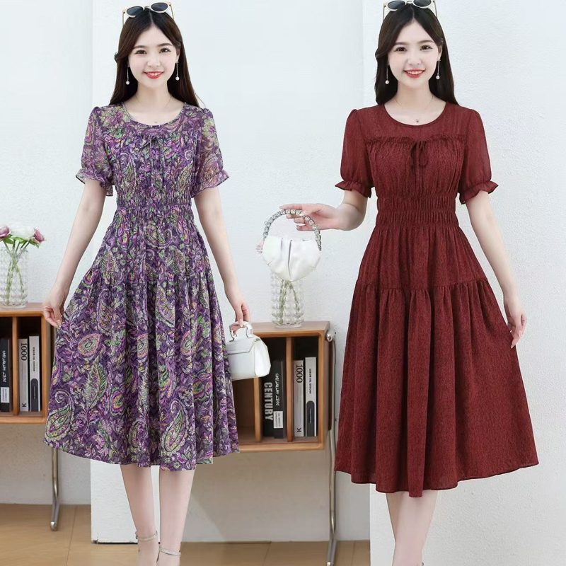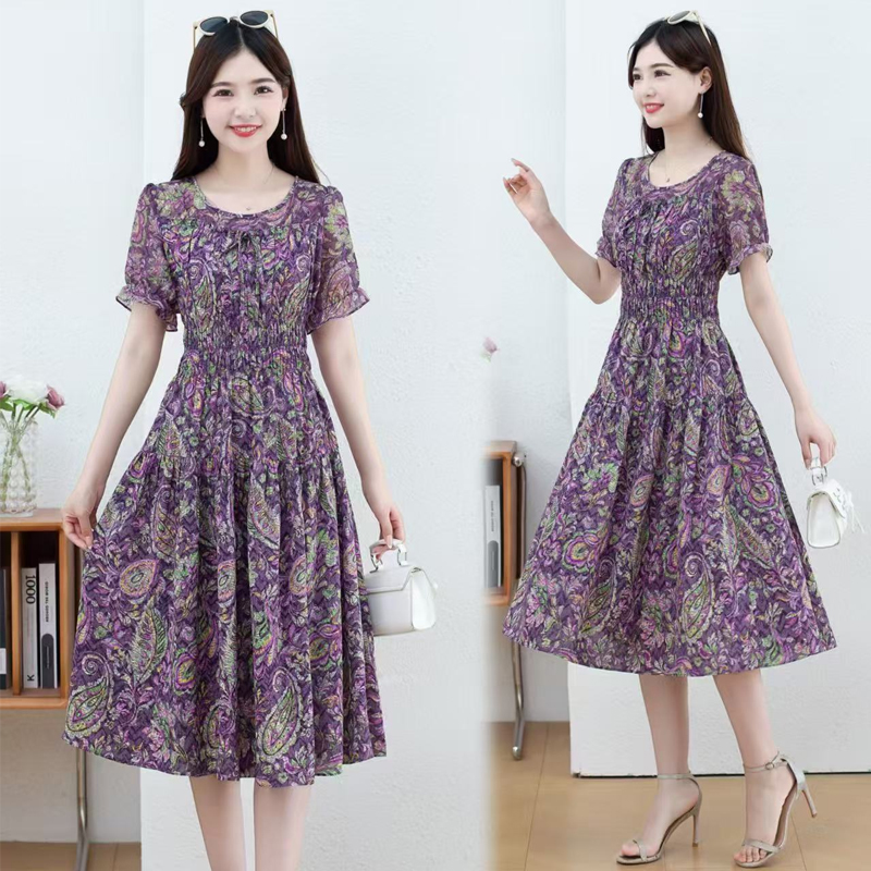 BY14317# 时尚印花雪纺连衣裙女夏季新款气质中长款流行洋气裙子韩版 服裝批發女裝批發服飾貨源