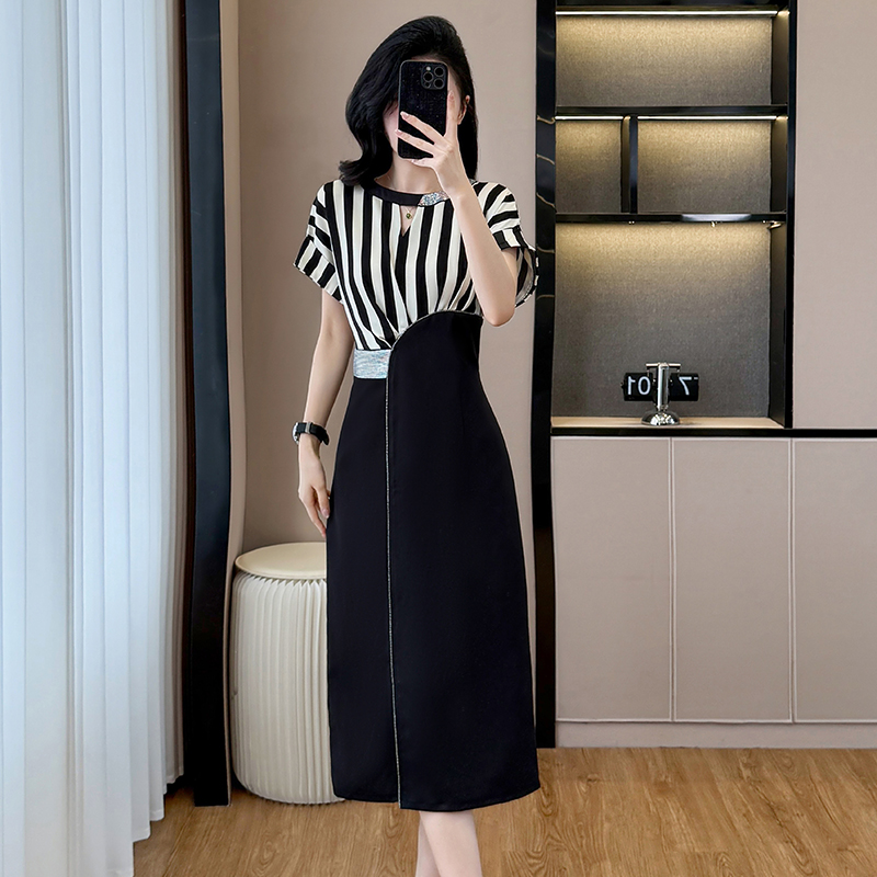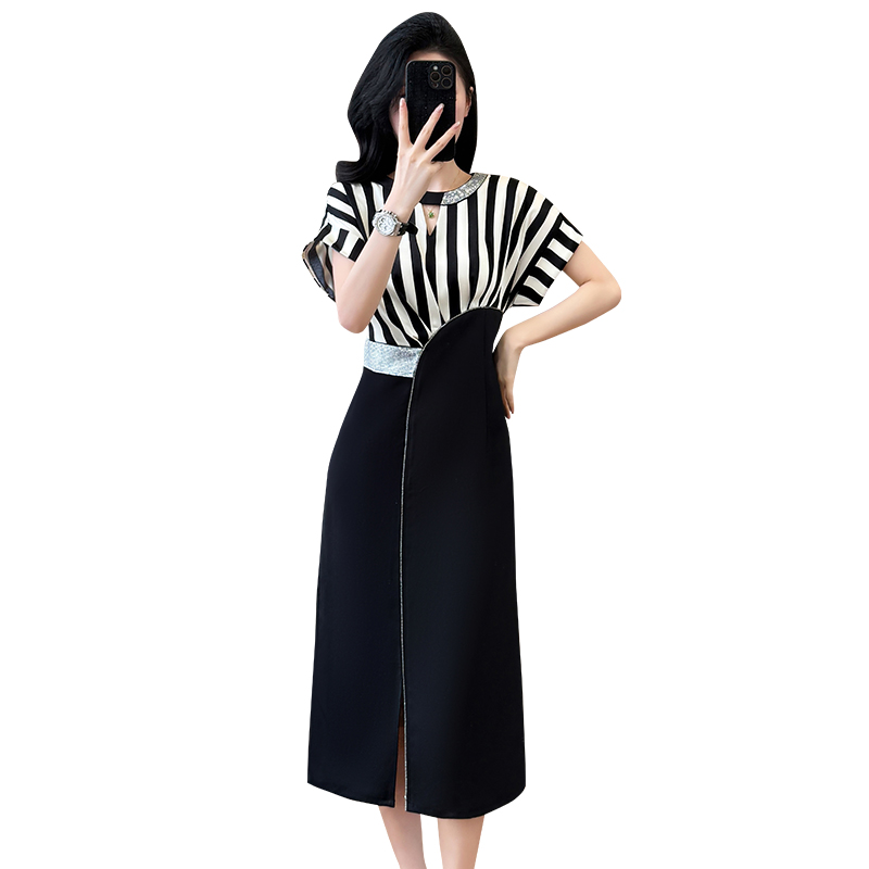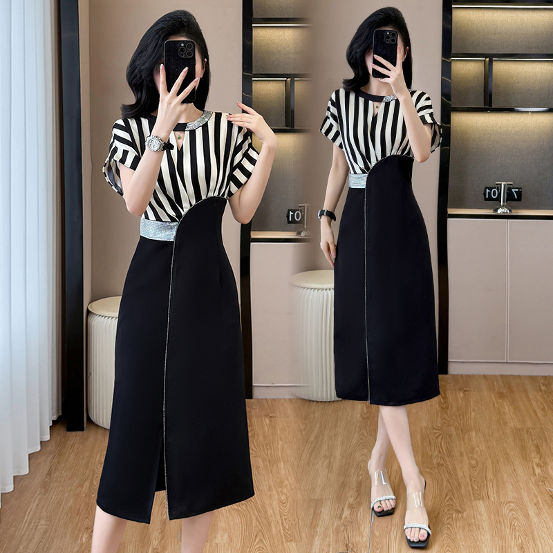 BY14349# 大码女装夏季新款小众设计感醋酸缎条纹撞色拼接显瘦连衣裙 服裝批發女裝批發服飾貨源