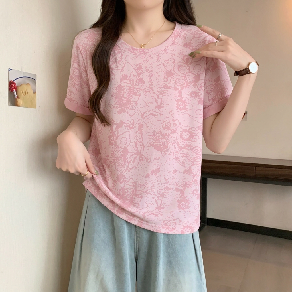 BY14403# 夏季新款欧货粉色印花圆领短袖t恤大码女胖MM设计感别致洋气上衣 服裝批發女裝批發服飾貨源