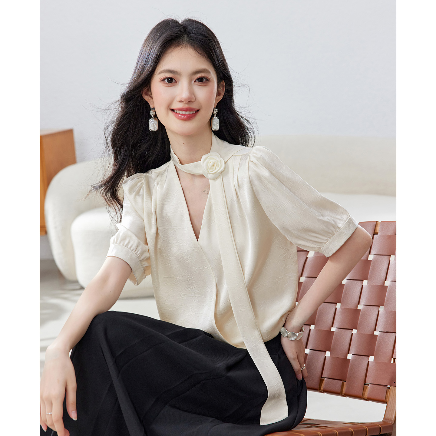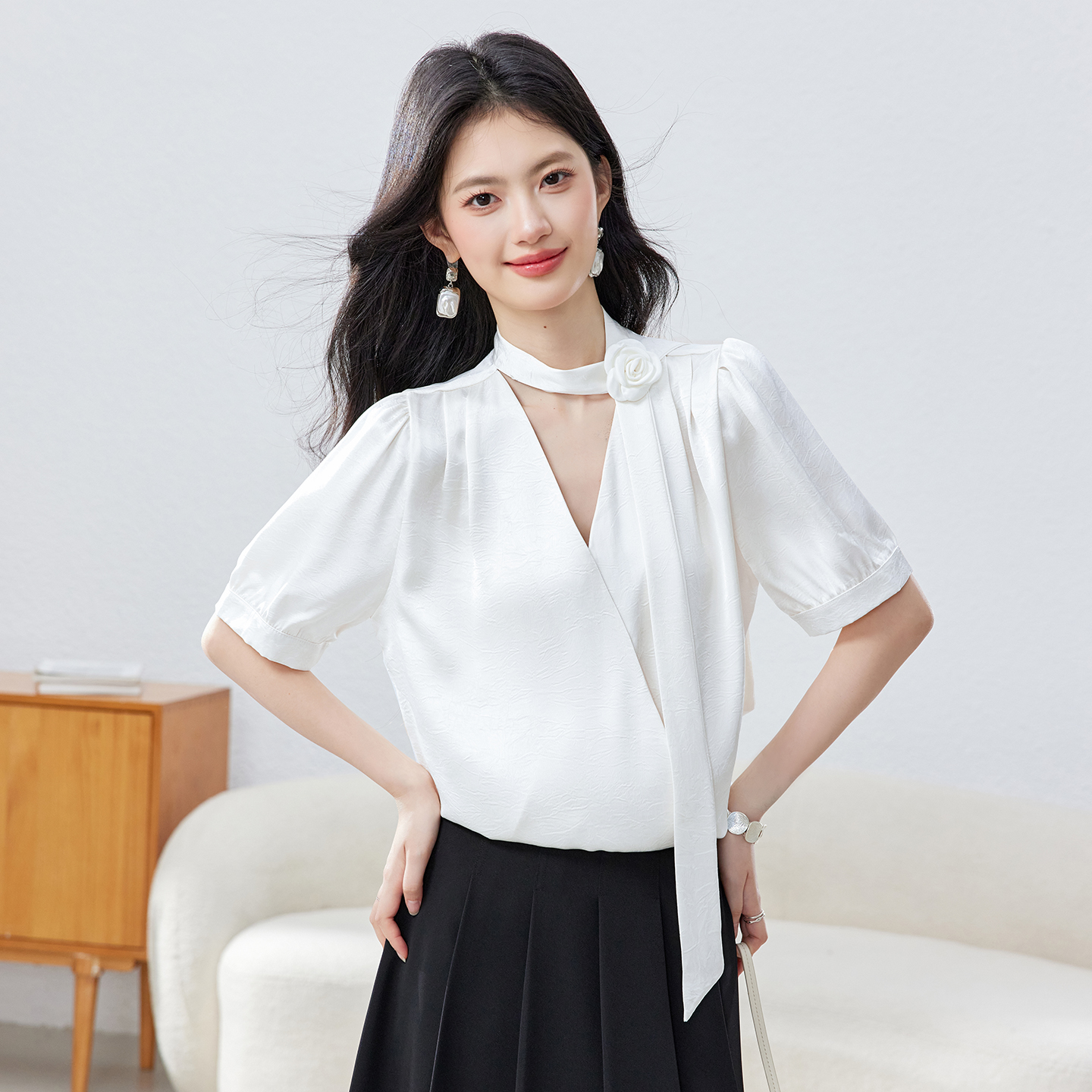 BY14440# 职业通勤面试短袖衬衫女士夏季新款法式气质V领飘带上衣服裝批發女裝批發服飾貨源