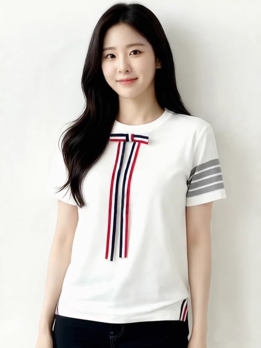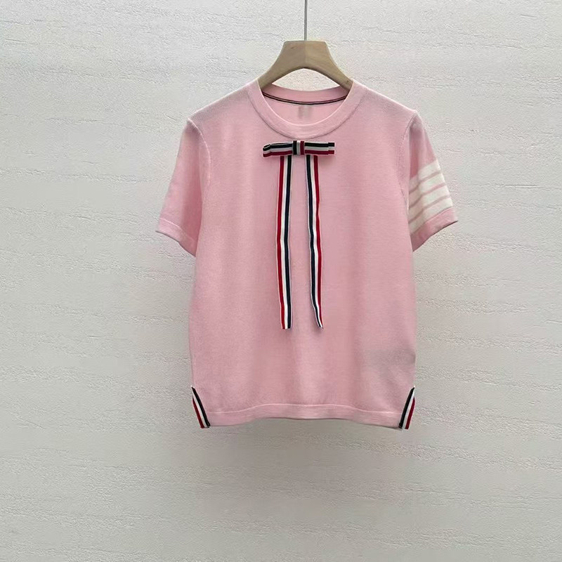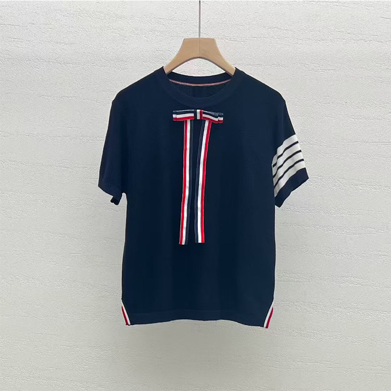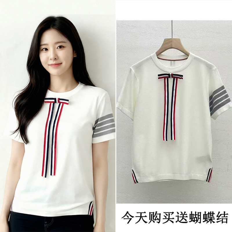 BY14458# 四条杠蝴蝶结圆领天丝针织衫短袖T恤女设计感上衣新款夏季服裝批發女裝批發服飾貨源