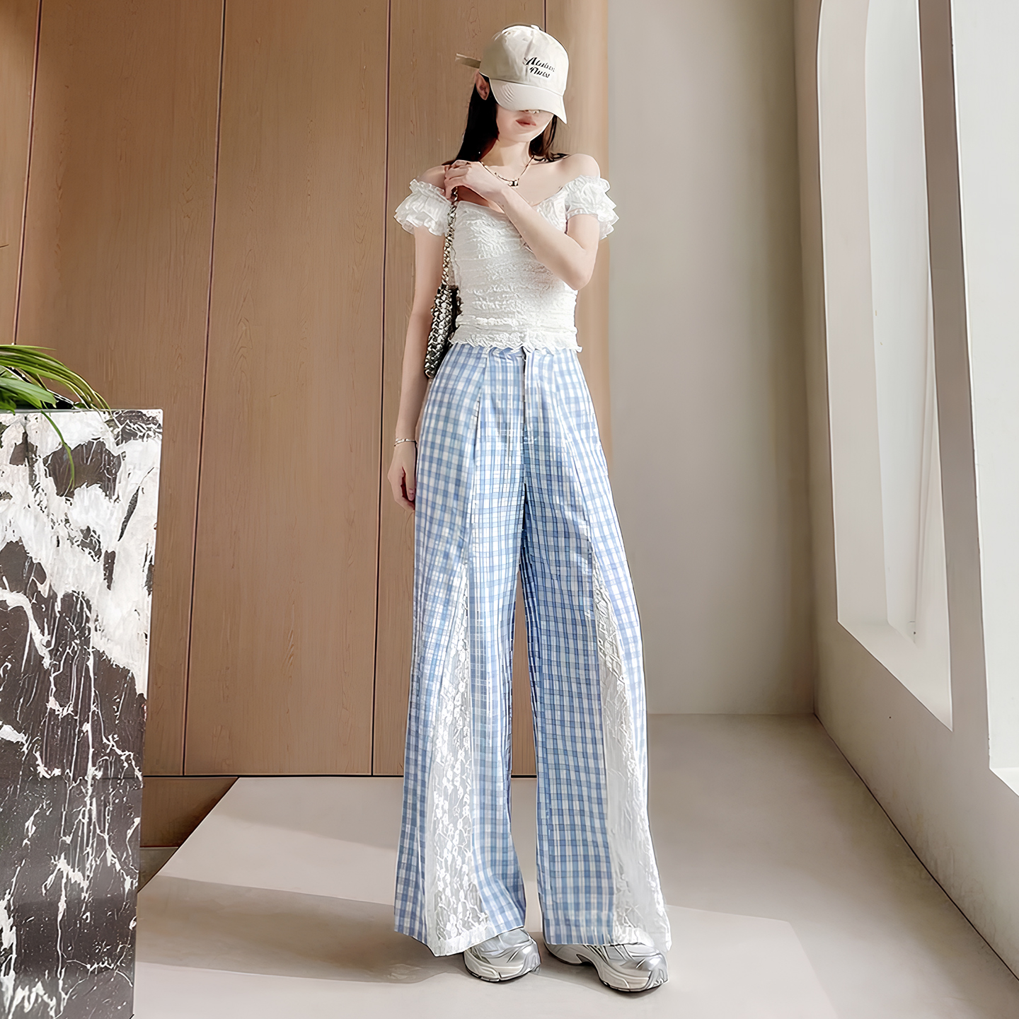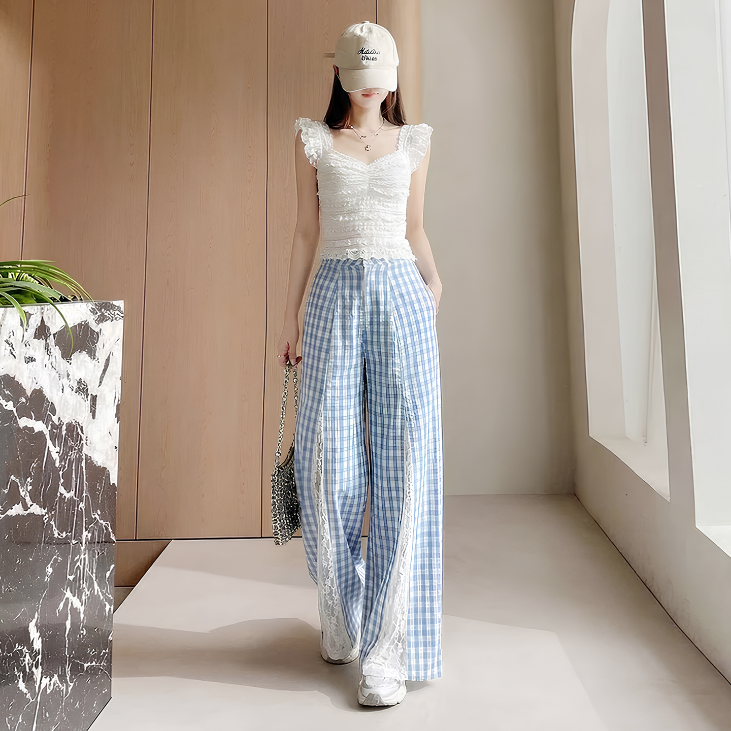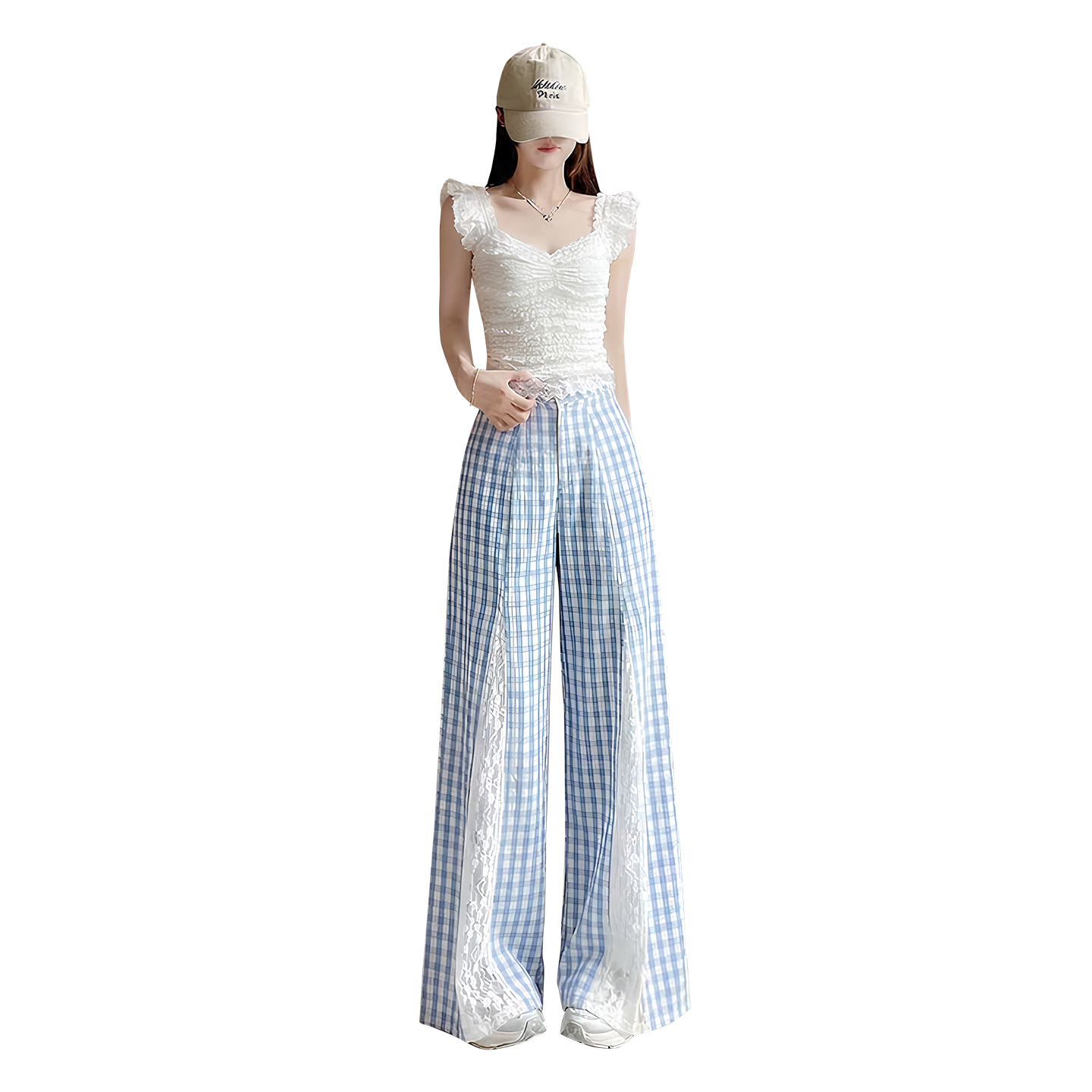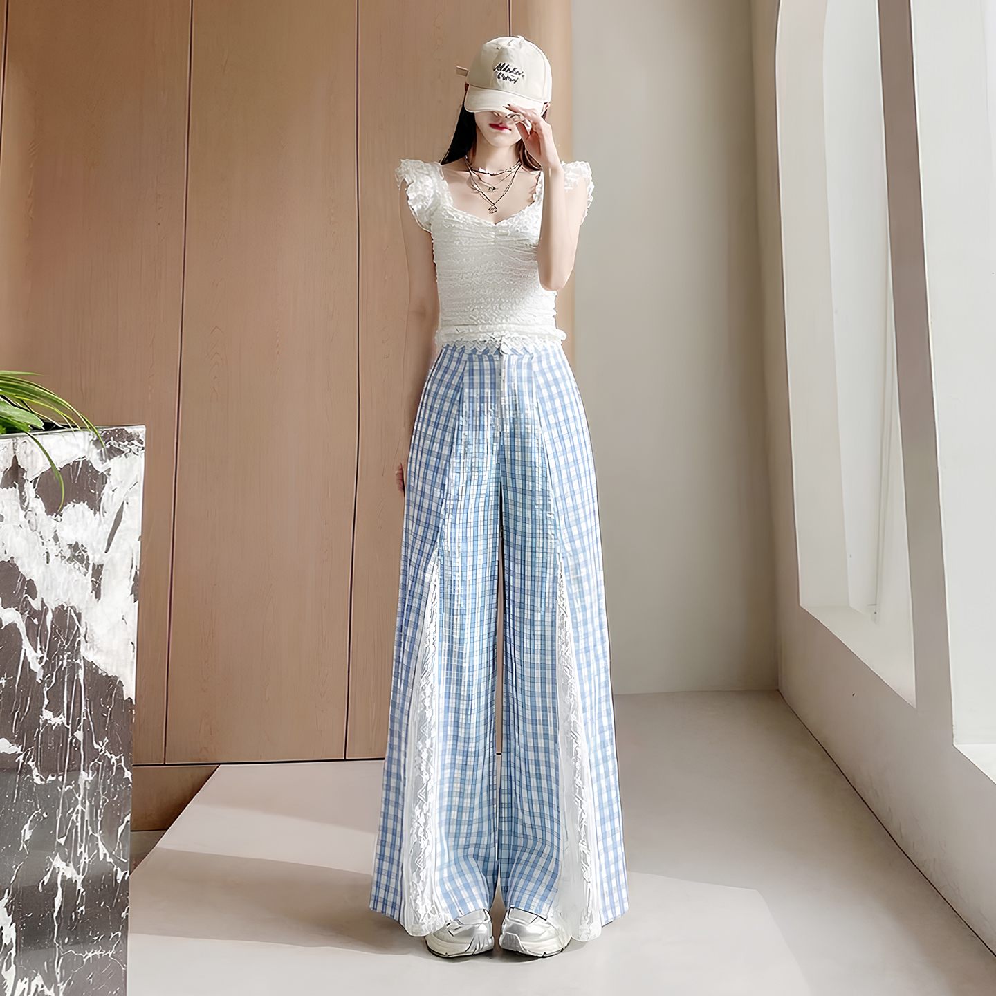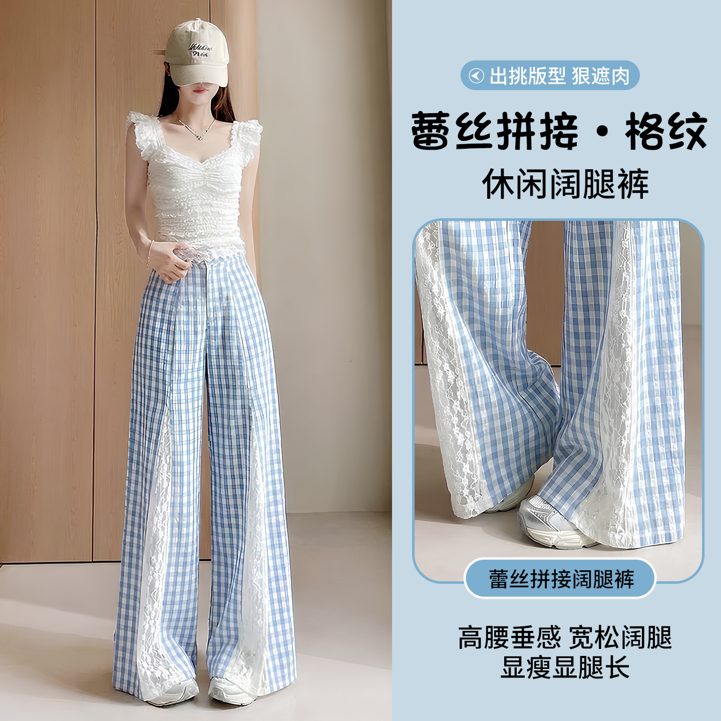 蓝色格子拼接蕾丝长裤