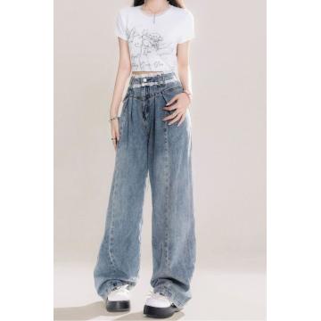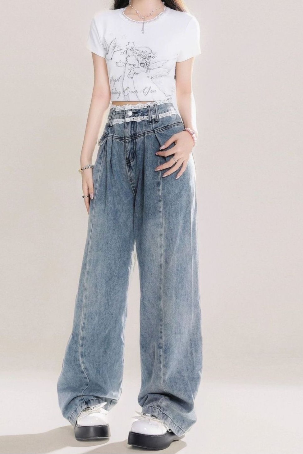 BY14651# 大码女装胖mm宽松复古褶皱蕾丝设计直筒裤高腰显瘦拖地阔腿牛仔裤 服裝批發女裝批發服飾貨源