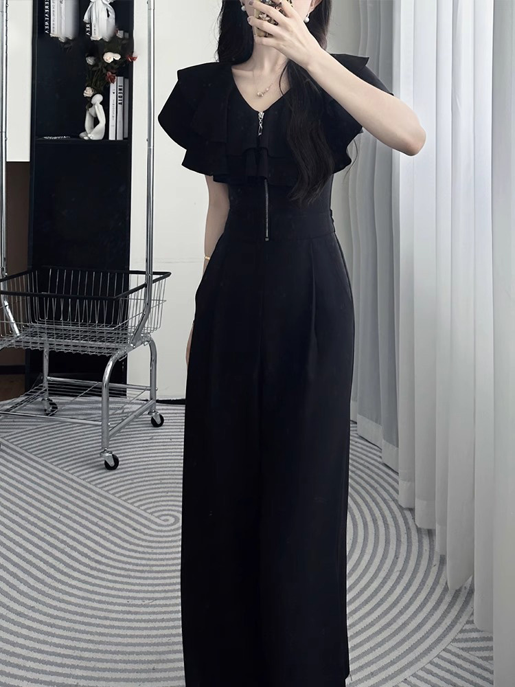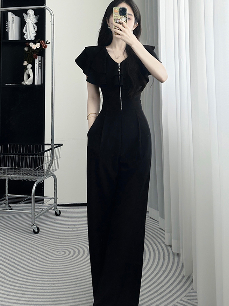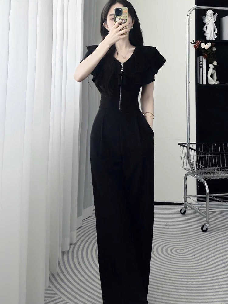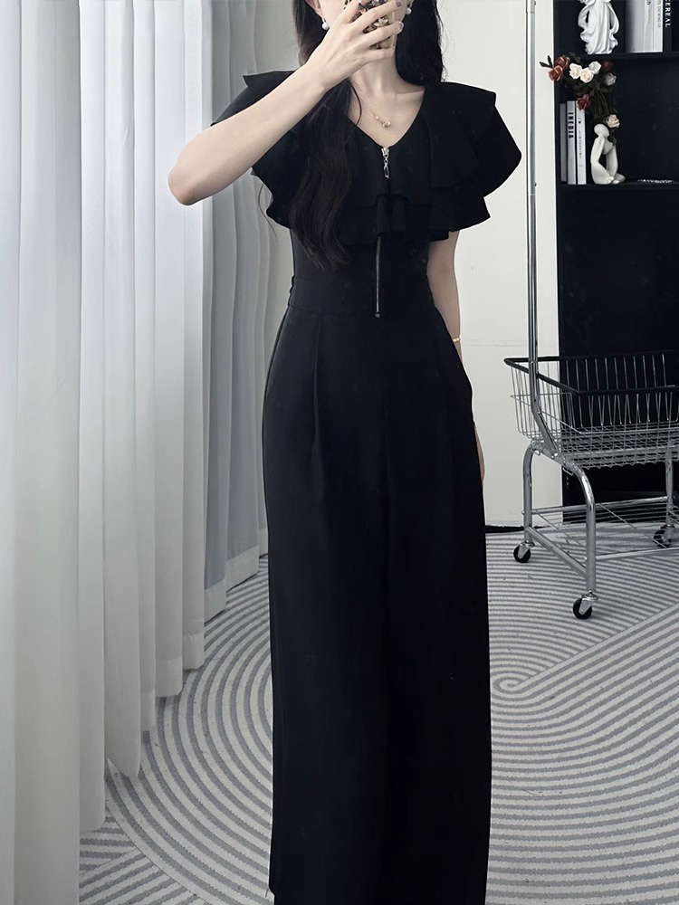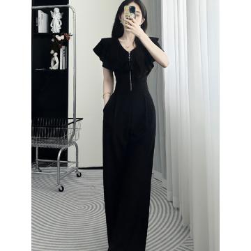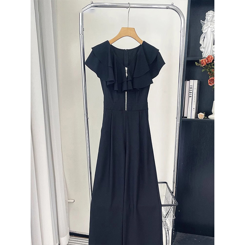 BY14668# 新款黑色阔腿连体裤女夏气质轻奢高级感荷叶边大方得体连身裤 服裝批發女裝批發服飾貨源