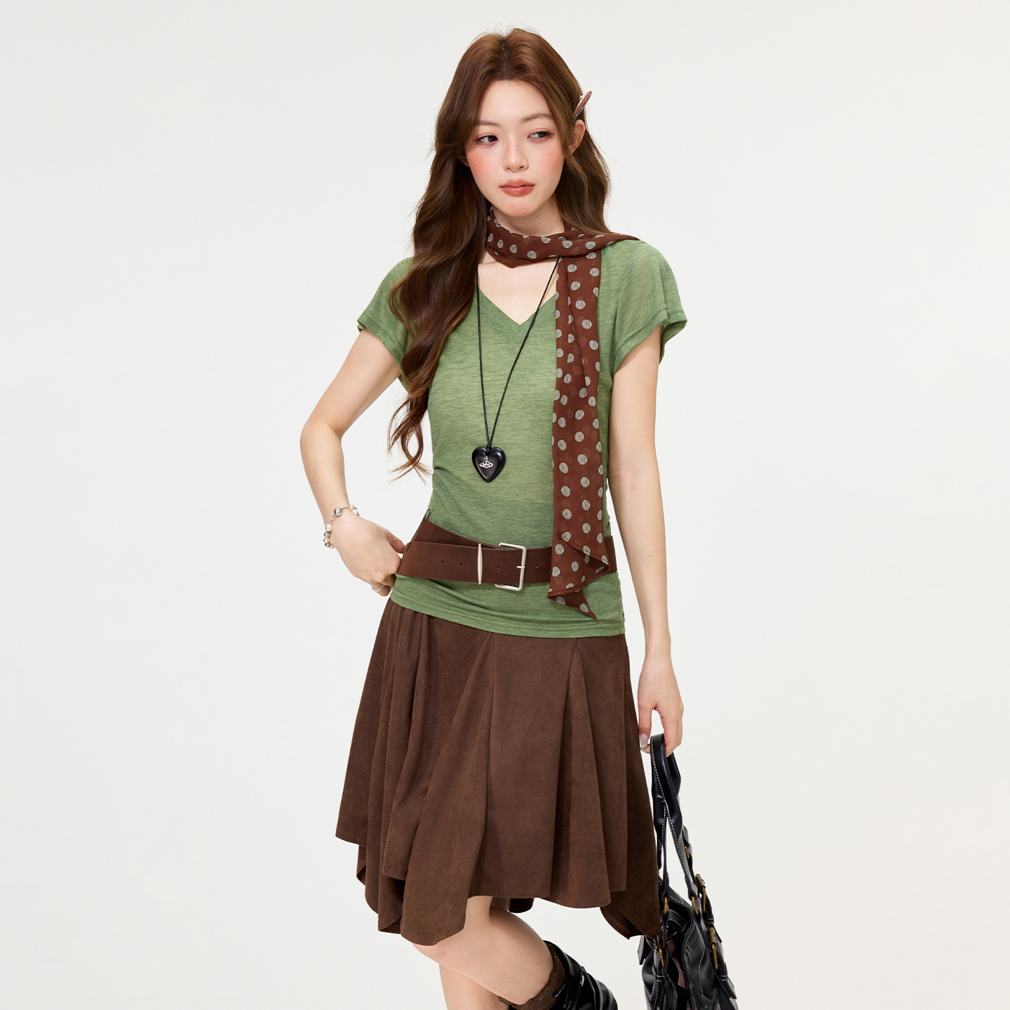 BY15590# 绿色V领正肩短袖t恤女夏季甜辣妹修身显瘦高级感上衣 服裝批發女裝批發服飾貨源
