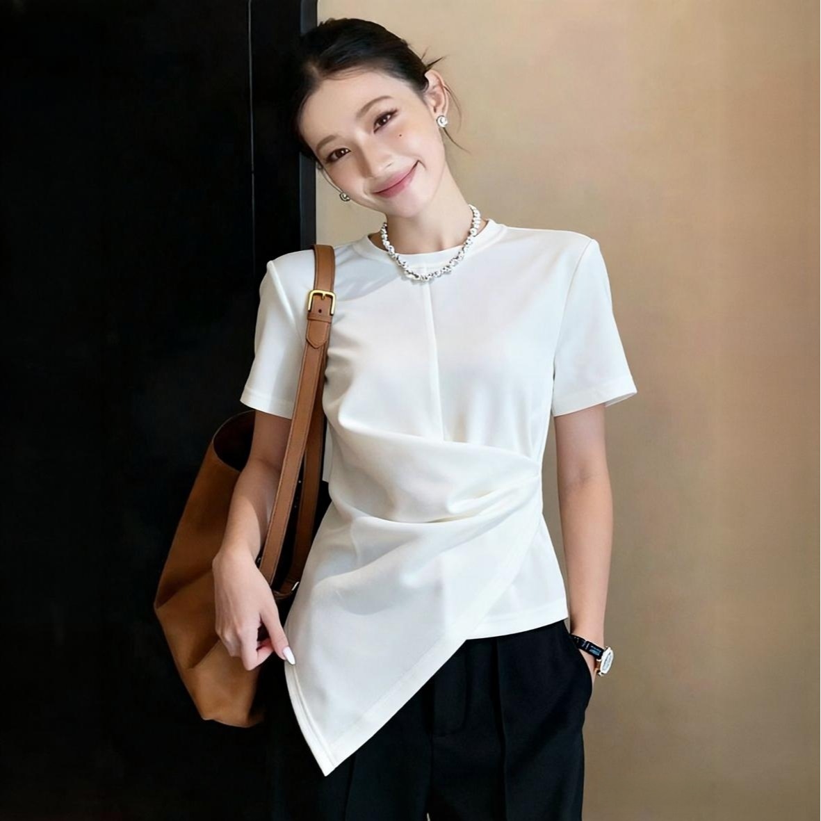 BY15631# 夏季新款白色法式高级简约收腰不规则设计短袖T恤上衣 服裝批發女裝批發服飾貨源
