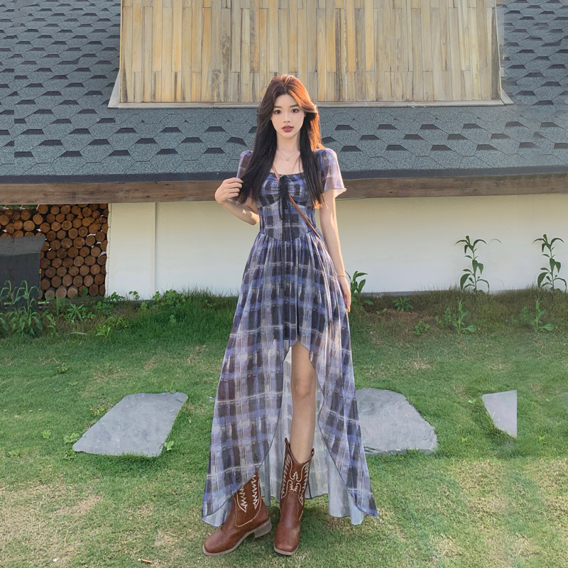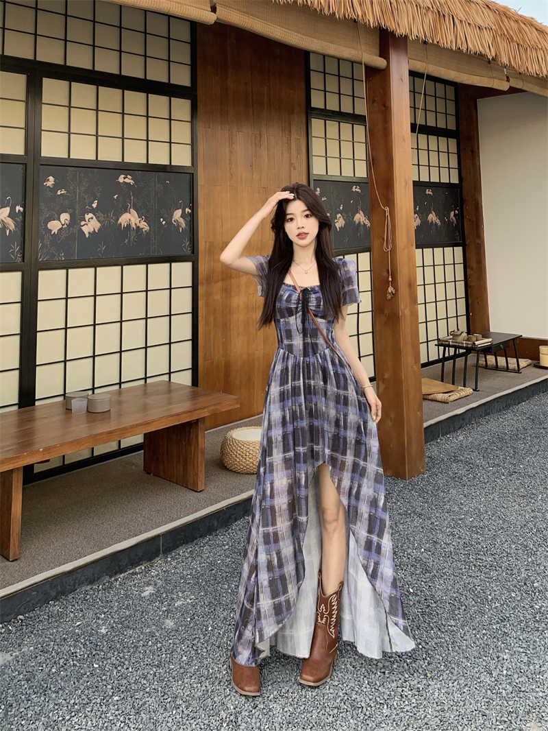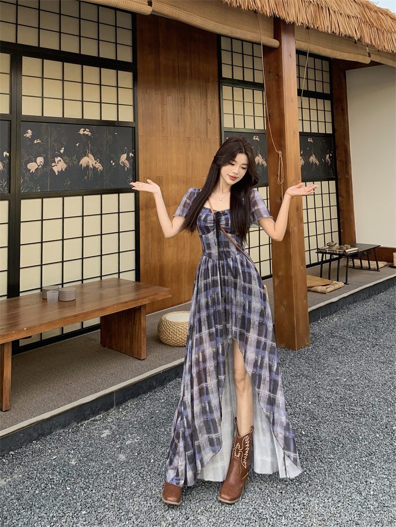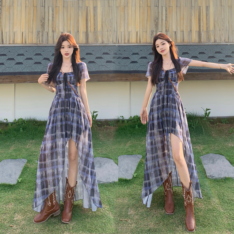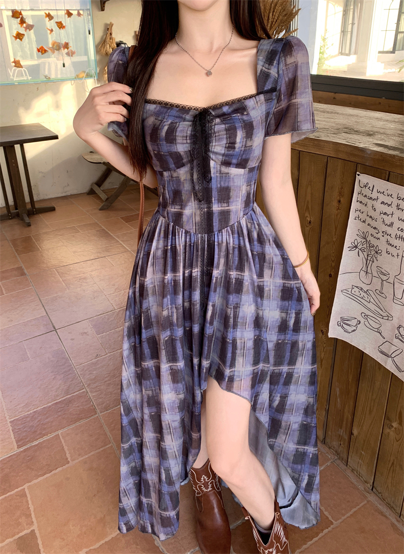 BY15854# 大码高智感韩艺术生格纹蕾丝短袖连衣裙胖mm显瘦不规则长裙 服裝批發女裝批發服飾貨源