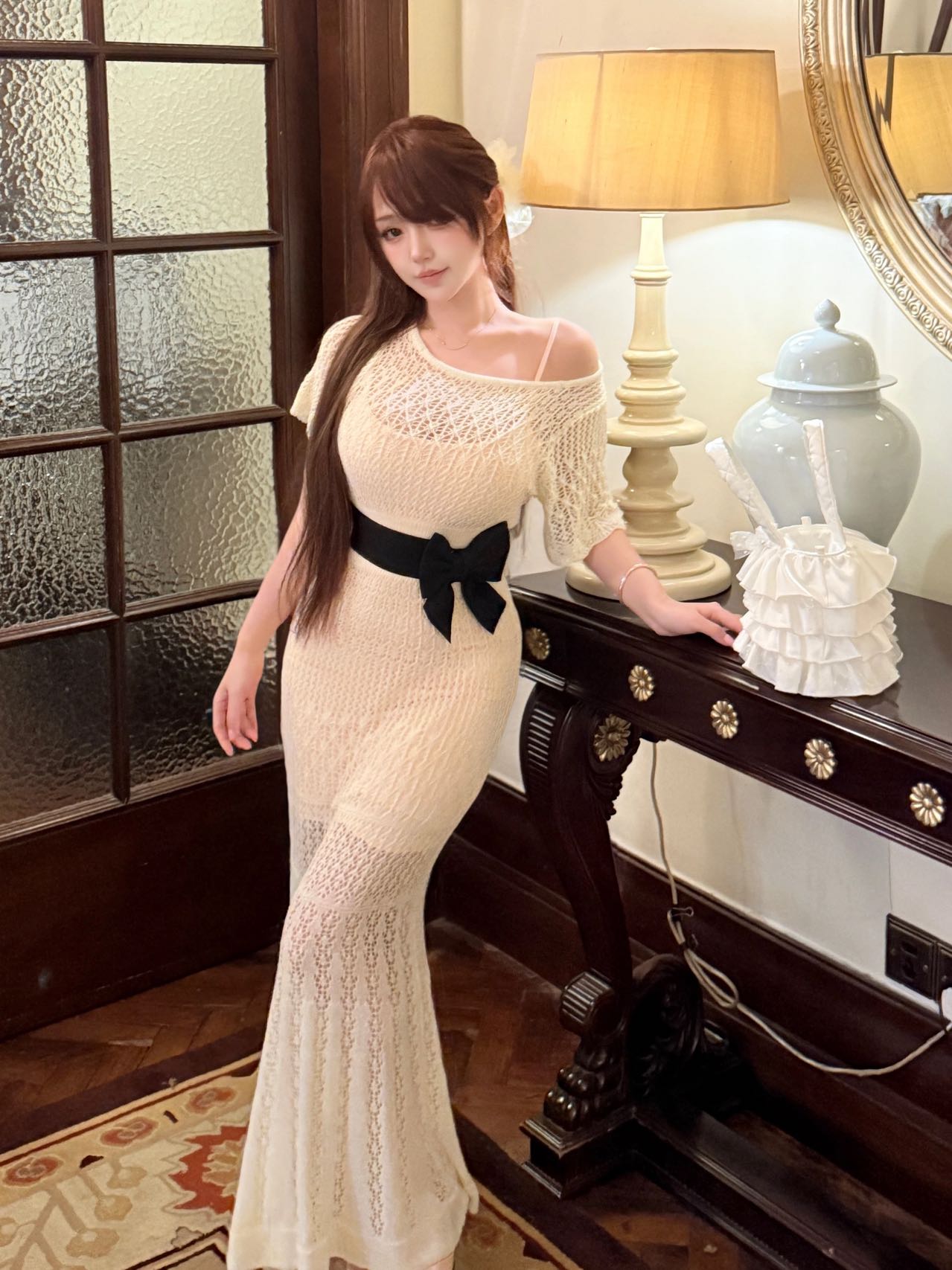 日系镂空针织长裙两件套叠穿蝴蝶结收腰显瘦气质弹力 服裝批發女裝批發服飾貨源