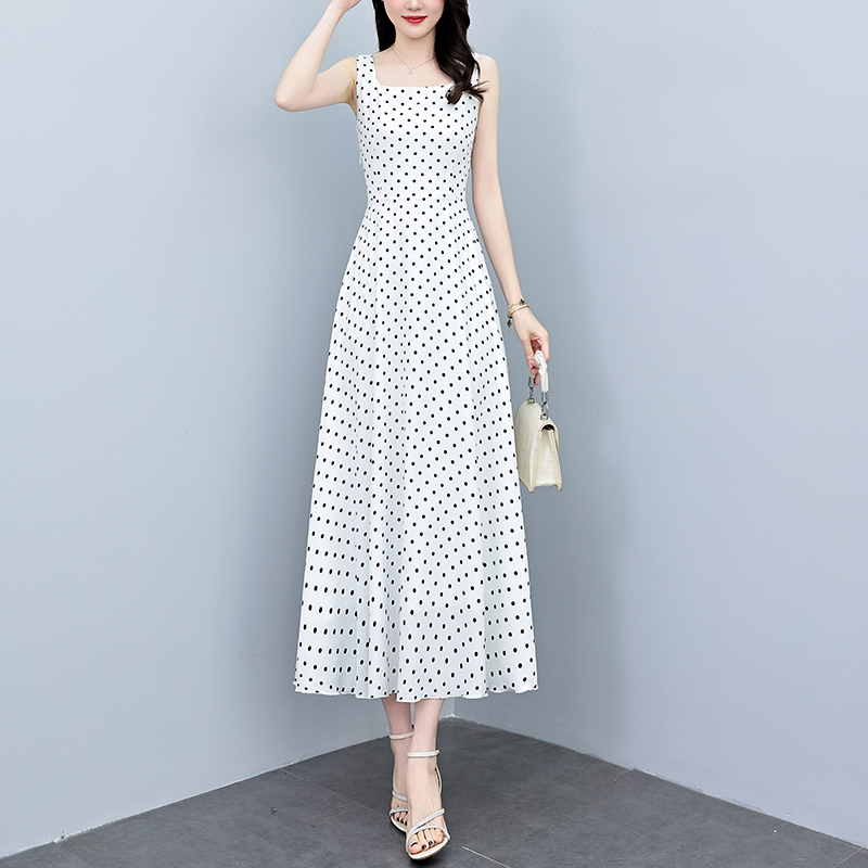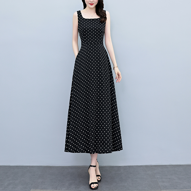 BY18294# 夏季新款波点无袖连衣裙女夏长款缎面收腰显瘦优雅打底长裙 服裝批發女裝批發服飾貨源