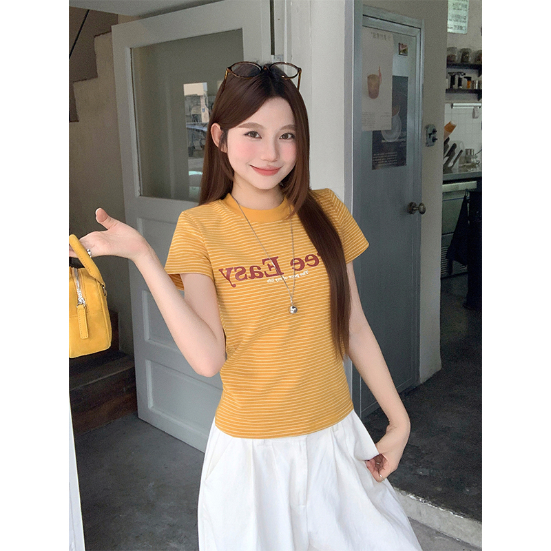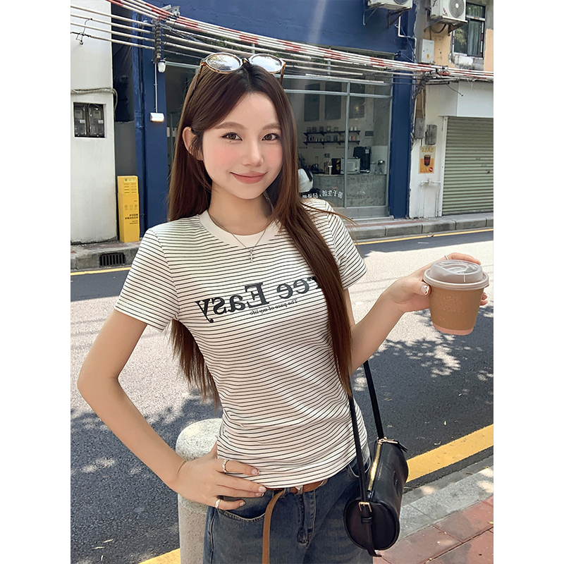 BY18324# 条纹字母印花圆领短袖t恤女夏季新款韩系设计感修身显瘦正肩上衣 服裝批發女裝批發服飾貨源