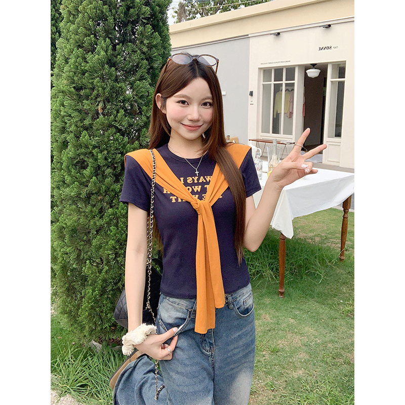 BY18327# 韩系通勤风撞色飘带短袖t恤女夏季新款字母印花修身短款百搭上衣 服裝批發女裝批發服飾貨源
