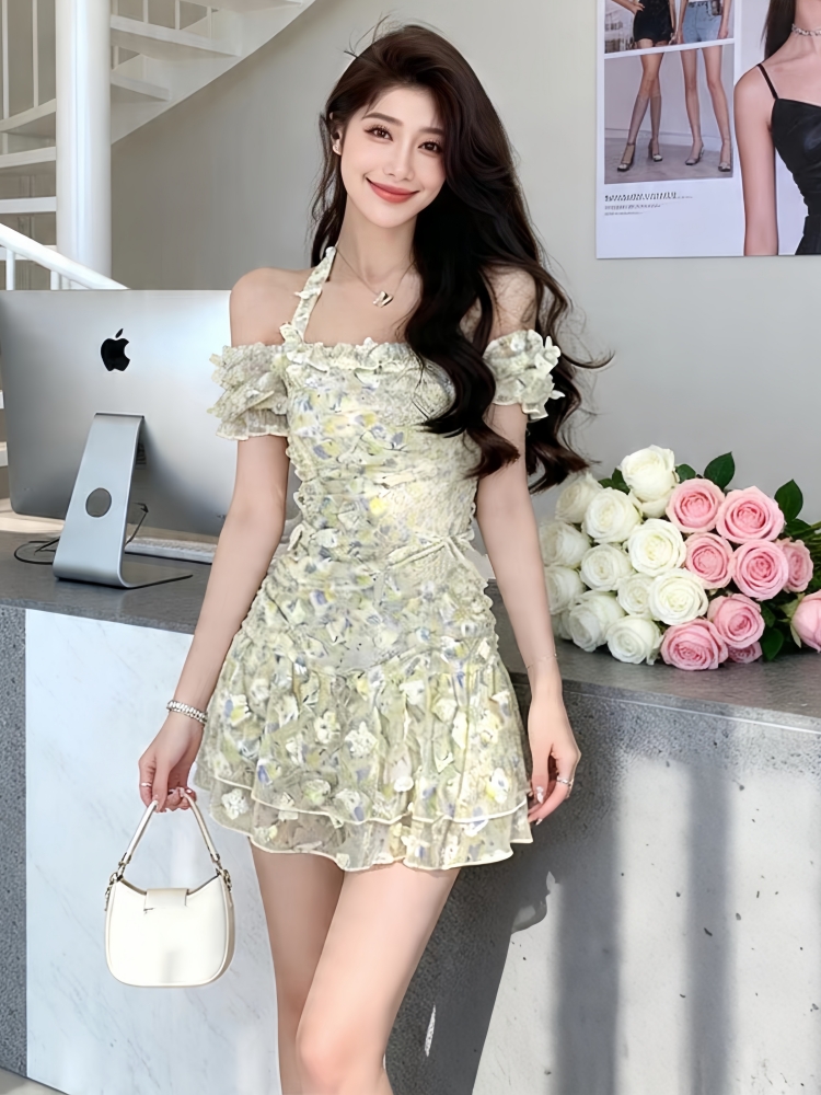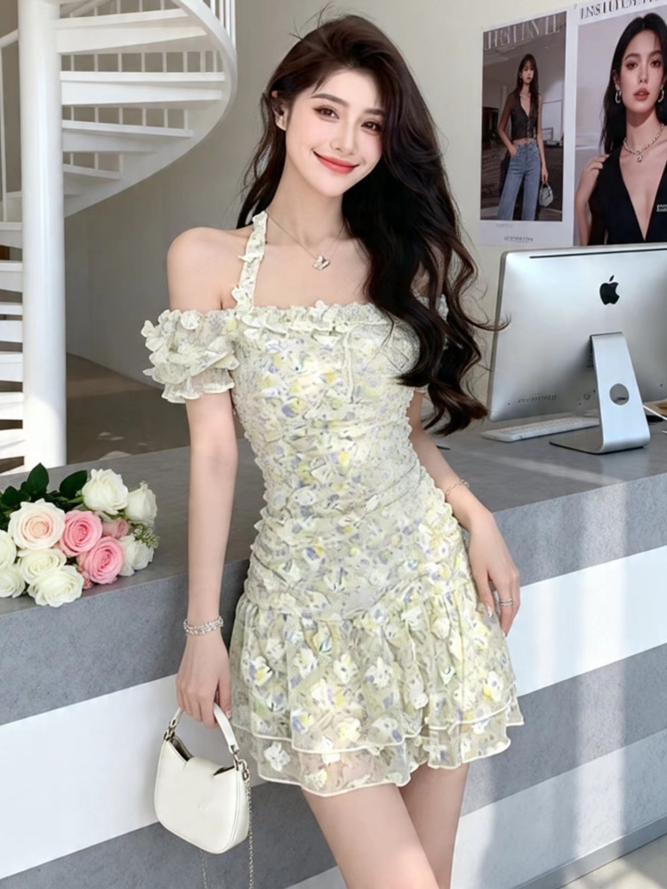 BY18337# 新款法式气质甜美海边度假挂脖吊带碎花连衣裙绝美小裙子女夏 服裝批發女裝批發服飾貨源