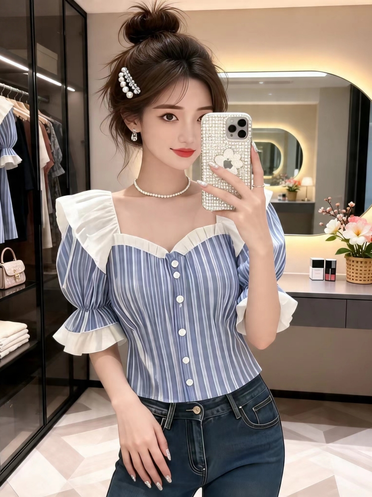 BY18339# 夏季新款纯欲风洋气减龄泡泡袖上衣女别致条纹显瘦短袖衬衫潮 服裝批發女裝批發服飾貨源