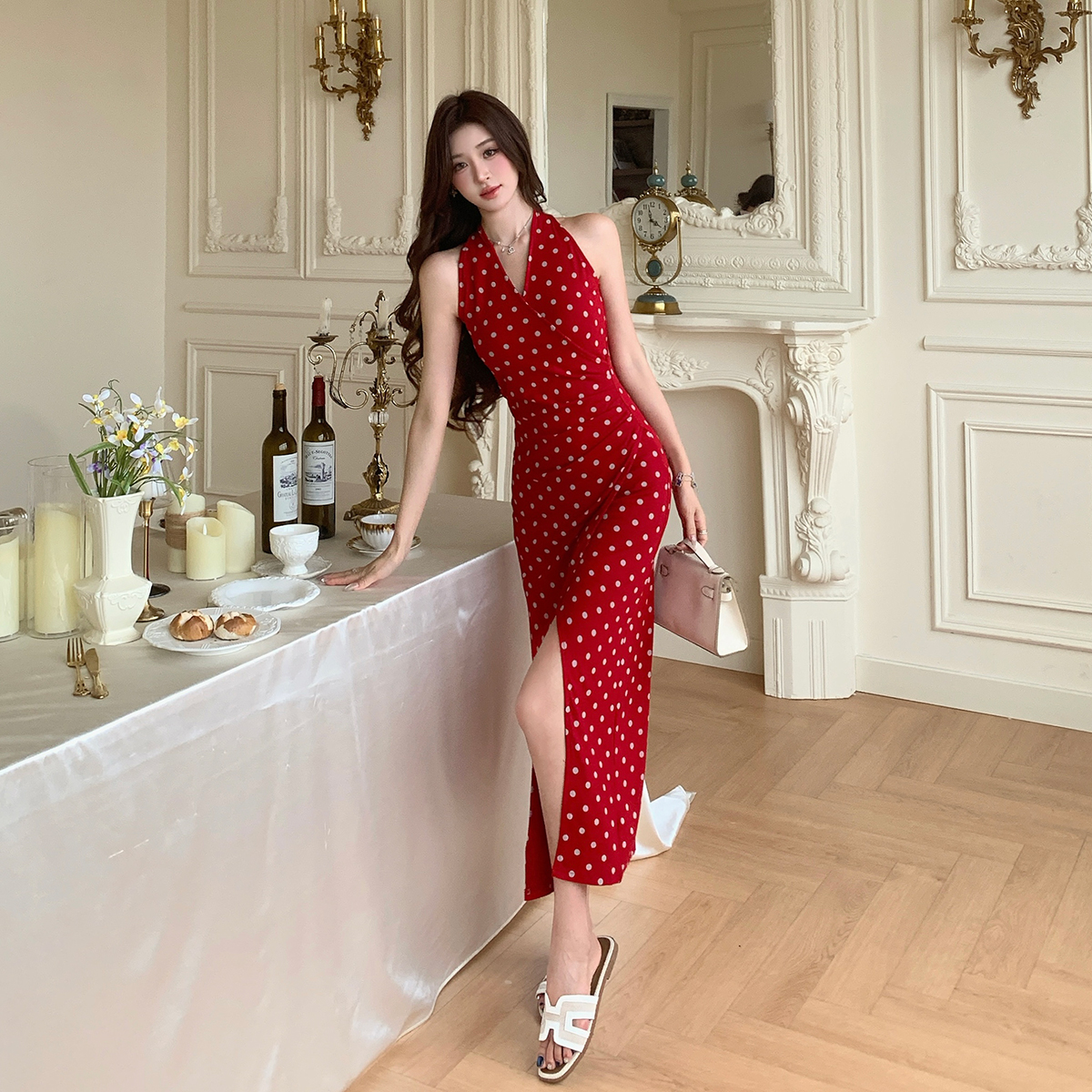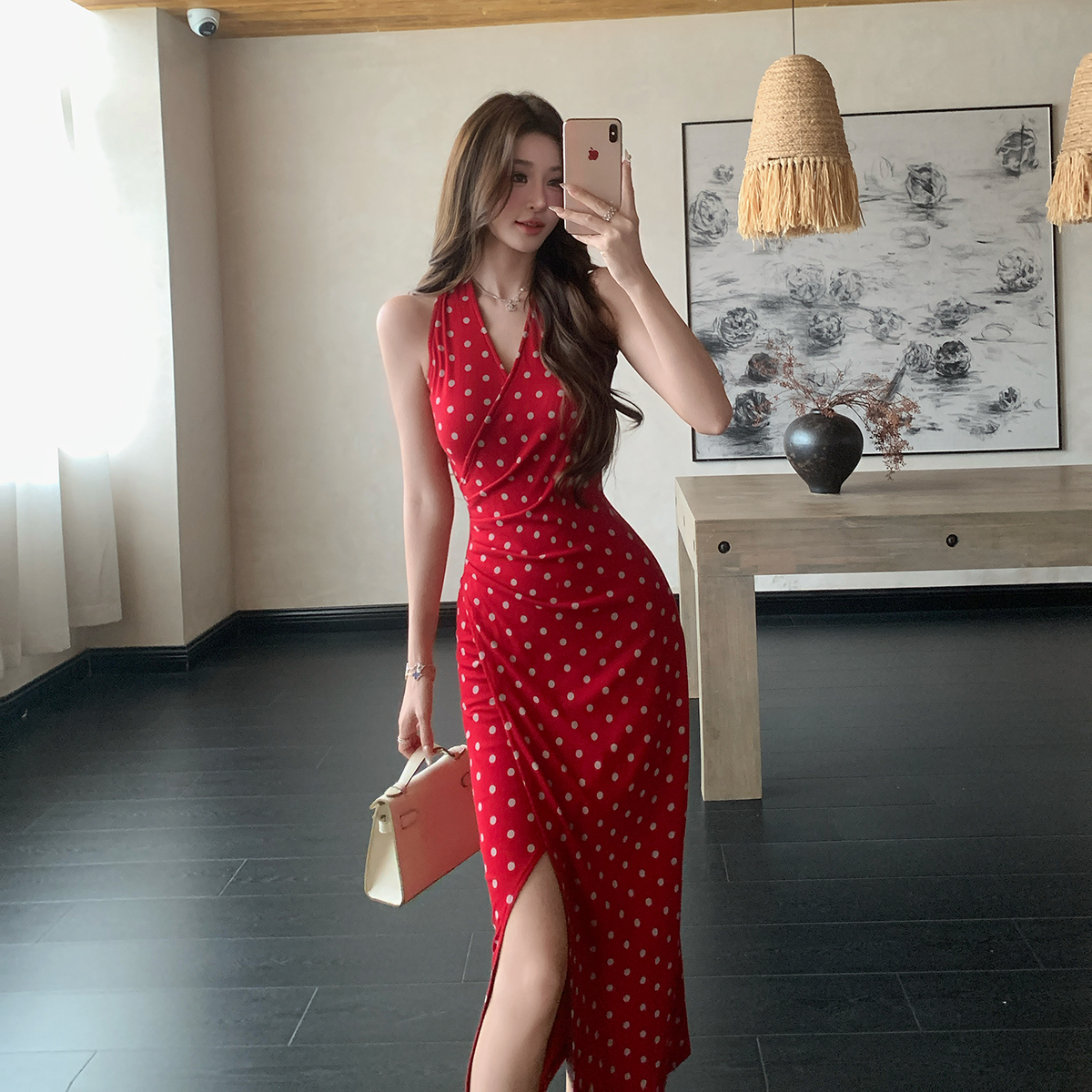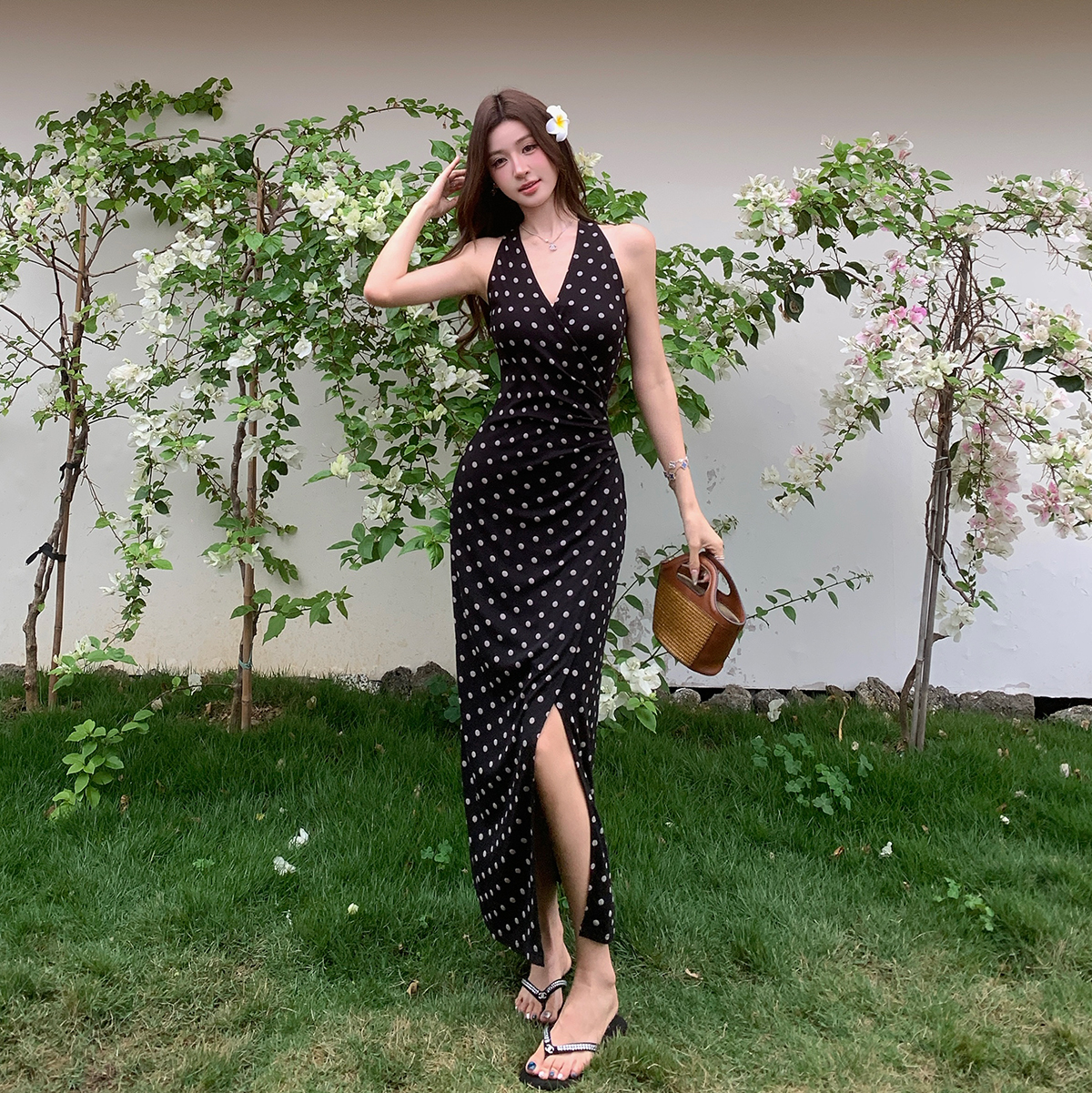 BY18343# 夏季新款百搭法式V领收腰长裙修身波点连衣裙开叉显瘦气质长裙女 服裝批發女裝批發服飾貨源