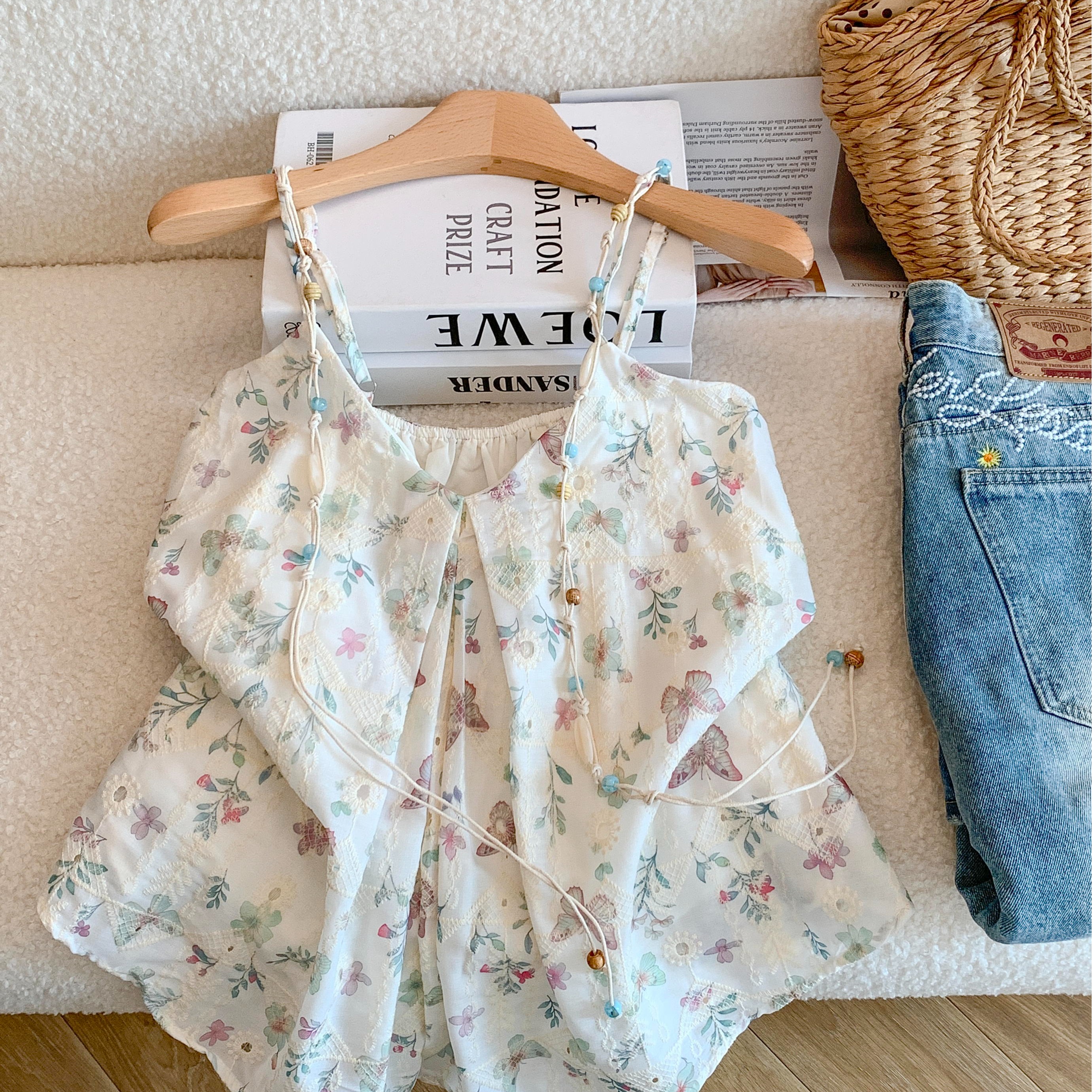 BY18497# ~夏季度假风甜美蝴蝶印花串珠吊带背心女夏季温柔宽松上衣 服裝批發女裝批發服飾貨源