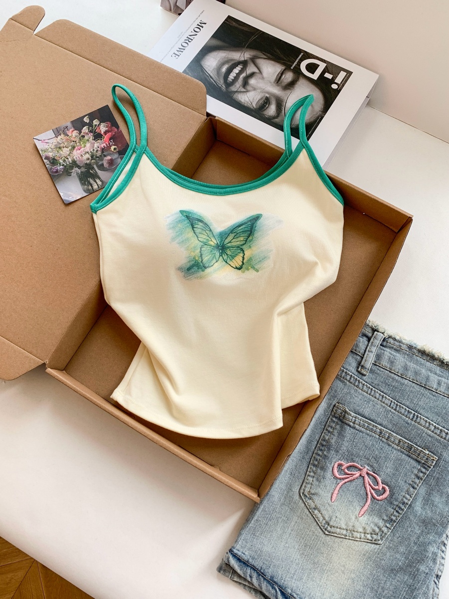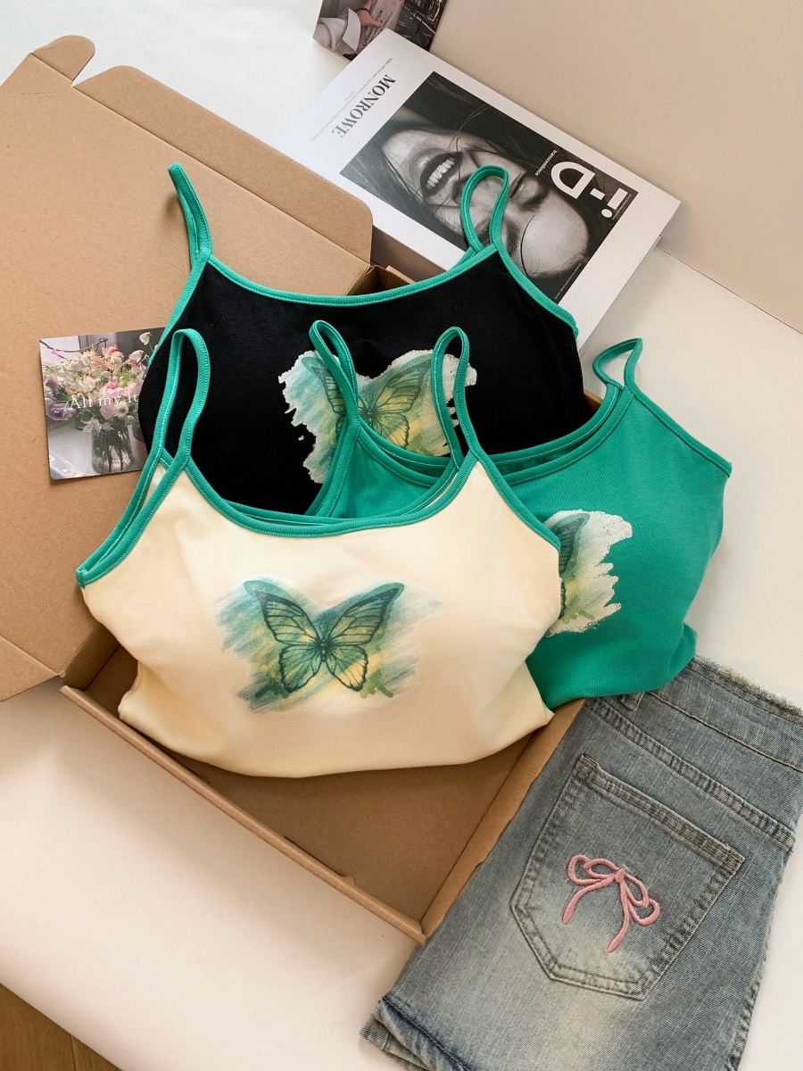 BY18502# ~设计感甜辣妹蝴蝶印花背心女内搭夏季外穿带胸垫短款上衣 服裝批發女裝批發服飾貨源