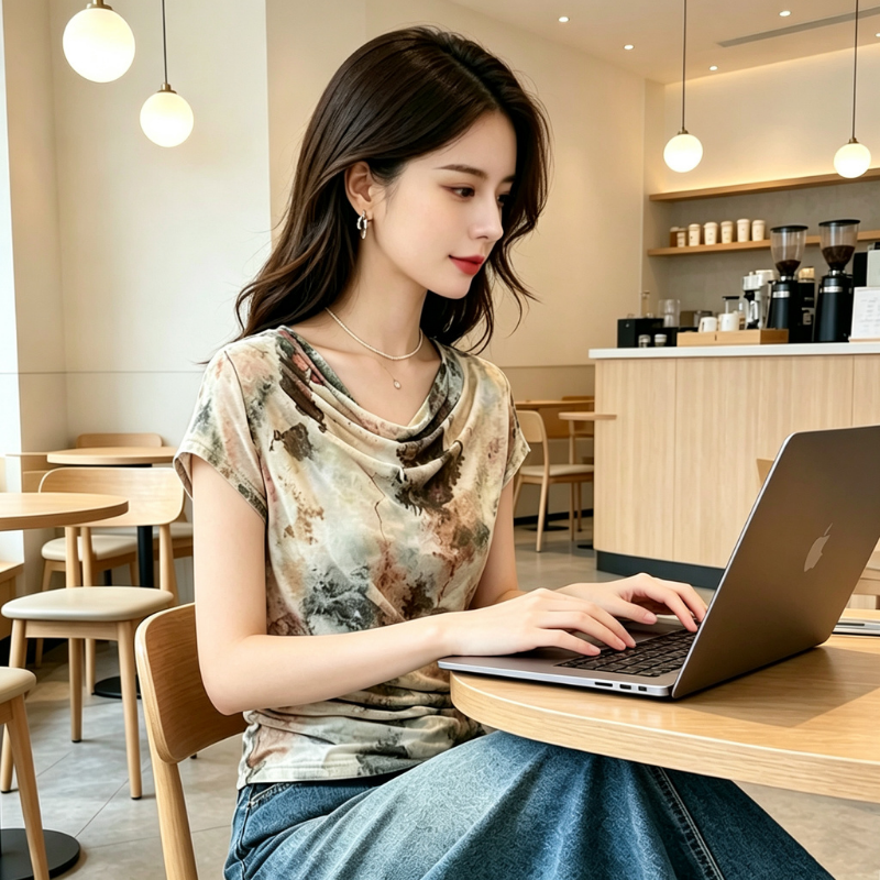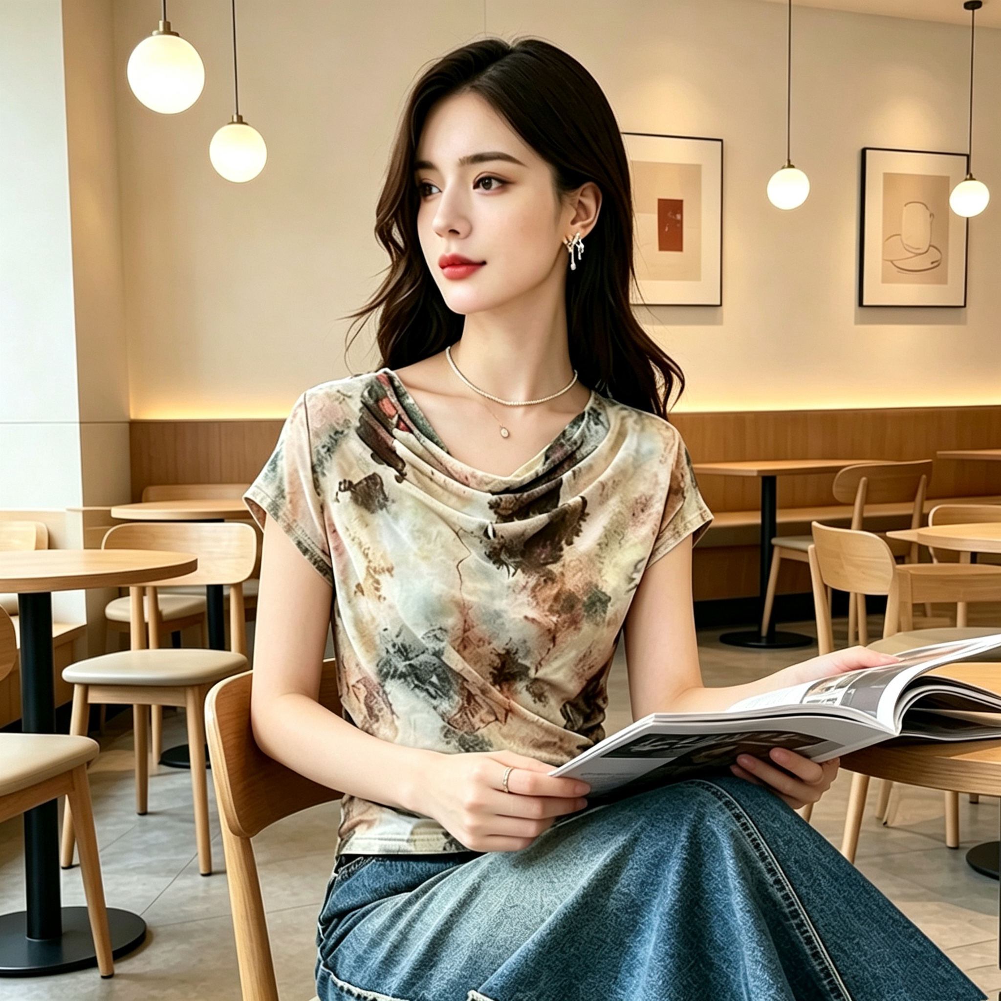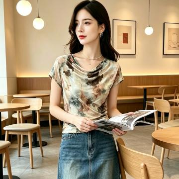 BY18541# 短袖设计感修身套头堆大圆领打底衫女夏新款印花上衣T恤 服裝批發女裝批發服飾貨源