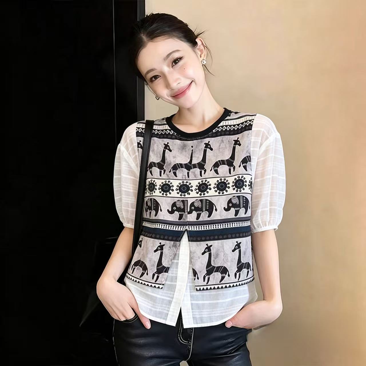 BY18549# 动物印花拼接假两件中袖衬衫女夏季新款时尚百搭条纹欧货上衣 服裝批發女裝批發服飾貨源